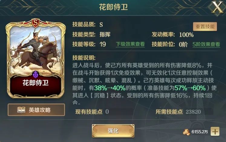 花郎侍卫的技能效果分两部份,前半部分主要能为队伍提供减伤和一次免疫控制的效果(不能免疫嘲讽),后半部分则是己方发动主动技能就能获得“沉稳”(降低受到的伤害)。