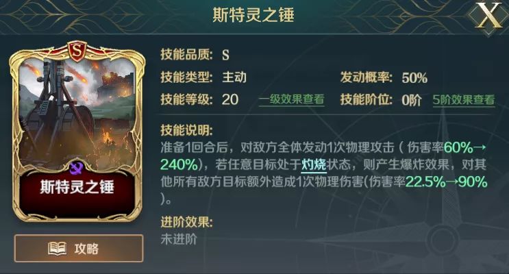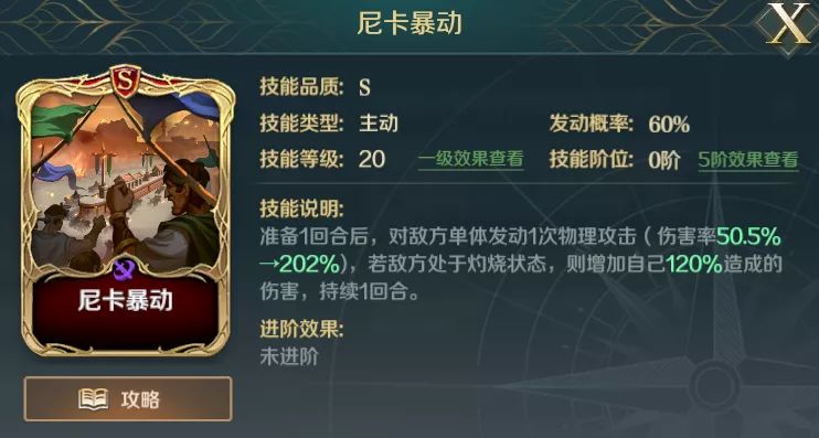 尼卡暴动则是打到灼烧状态的敌军,在造成伤害后可提高自身120%的伤害,配合斯特灵之锤则会在对敌军全体造成伤害后,再一次对所有敌军造成一次伤害,在技能的联动下打出爆发伤害。