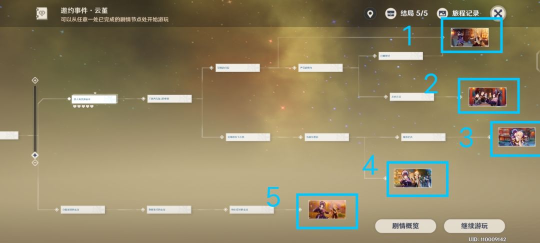 云堇的邀约事件总共有5个结局,以及3个成就(如图所示)。