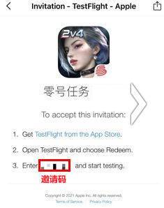 请登陆您预约游戏时留下的邮箱,找到发件人为TestFlight的邀请邮件并打开,复制说明页面中的邀请码。