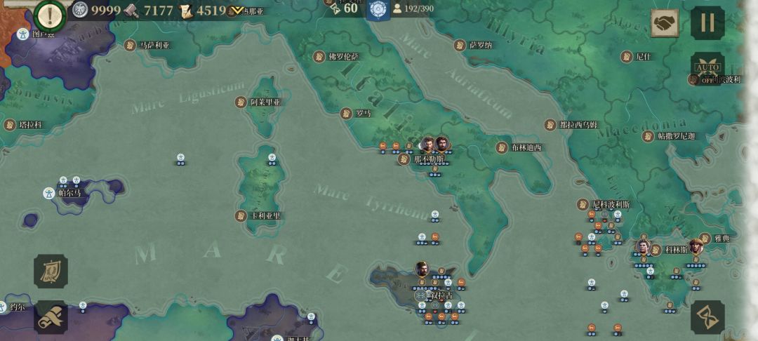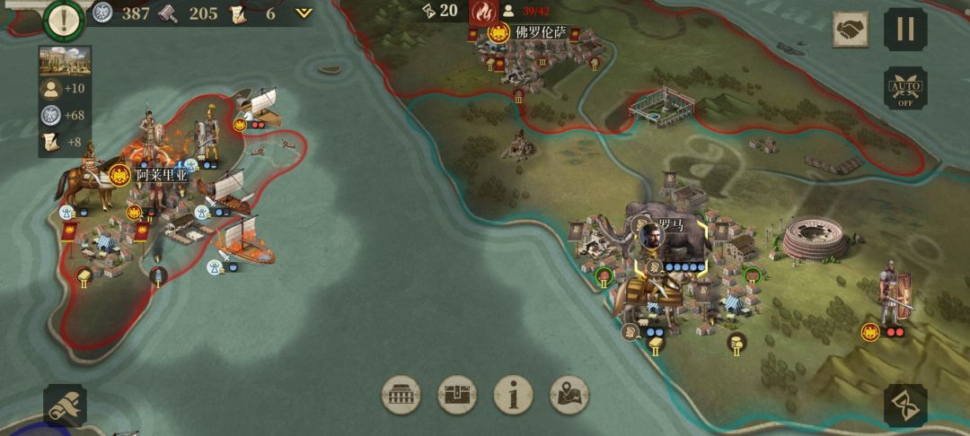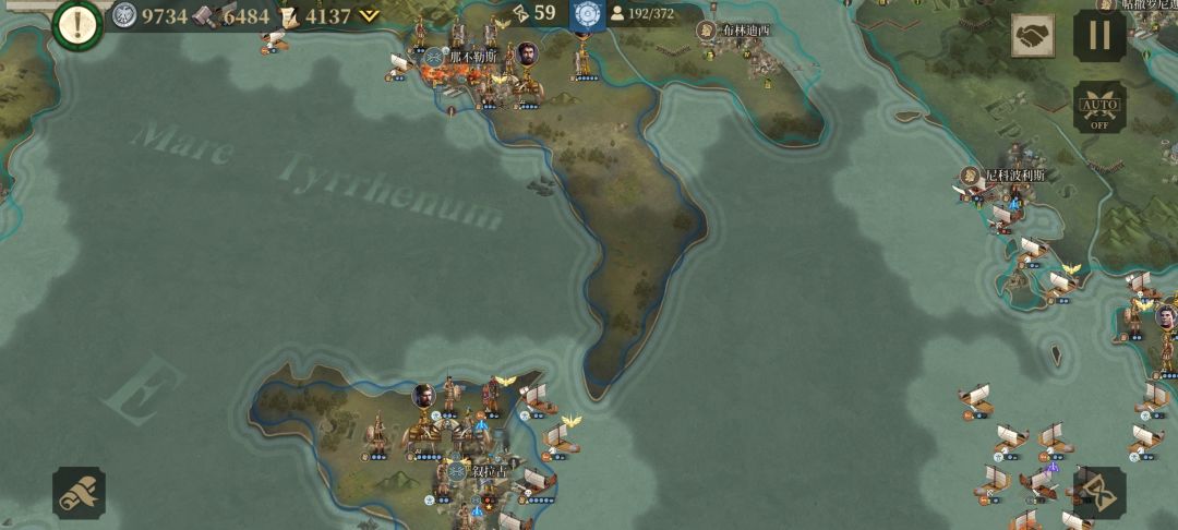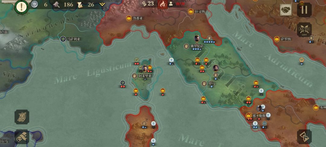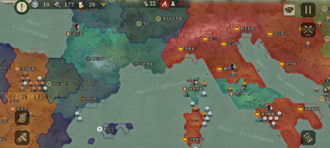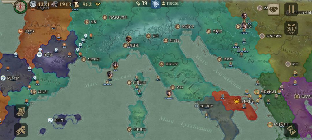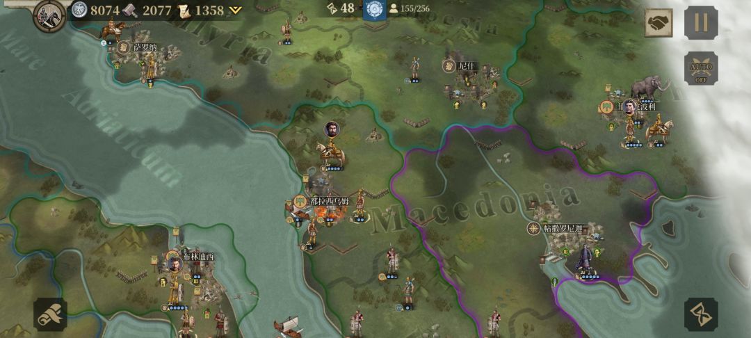我向下的念想被迦太基掐断了,所以宣战中立象,然后挺进地中海,见势占领罗马,基本扭转了战局,与迦太基争夺、平分战场主动权又不过送资源给它,一起撑;后秉着见好就收的原则,在巴尔干地区接连宣战盟友马其顿、奥德里西亚王国(因为它离雅典很近,不希望灭亡马其顿的国家,灭亡罗马的头衔都被它抢走,雅典不能让),地中海小国叙拉古,跨海领土扩大了2倍,迁都罗马,最后举兵灭,我总爱遗忘的普兰尼。