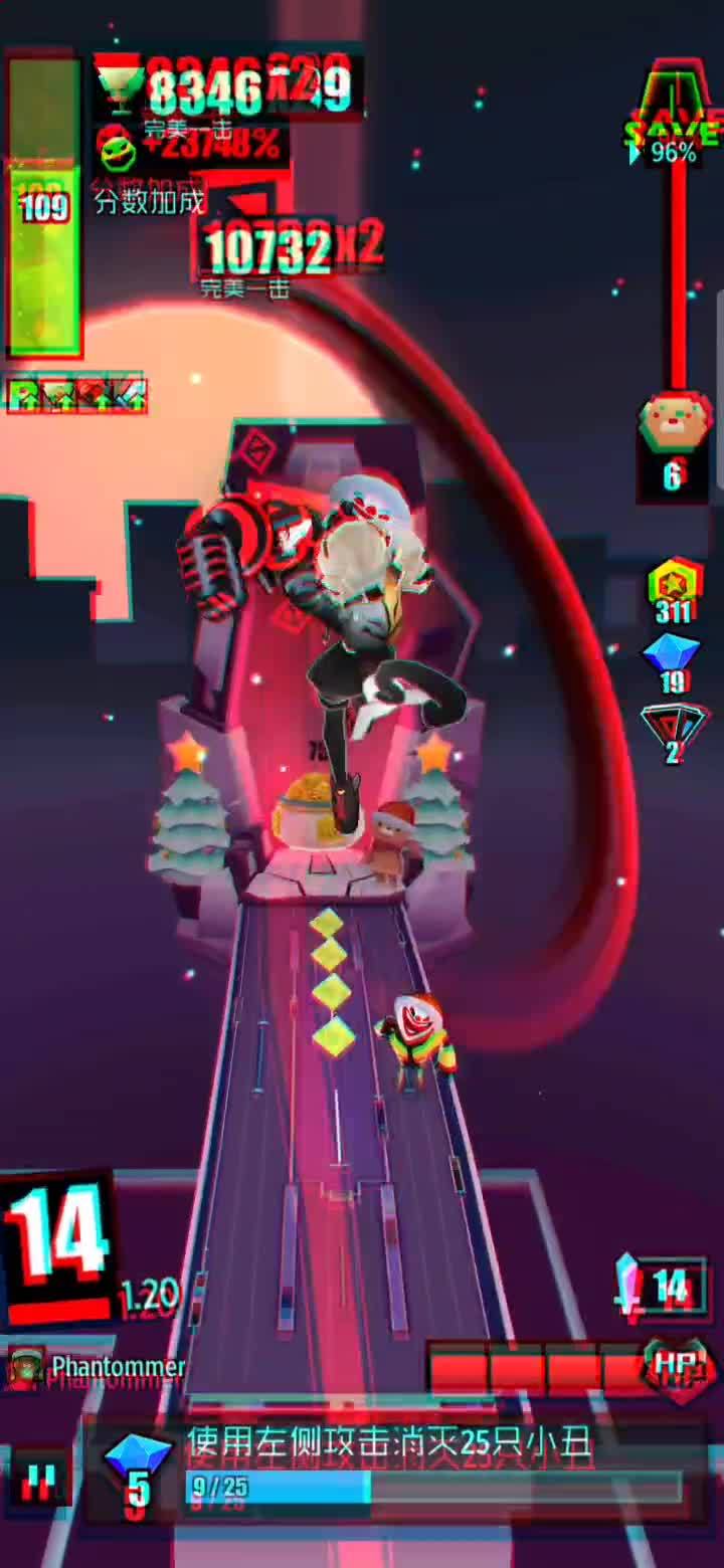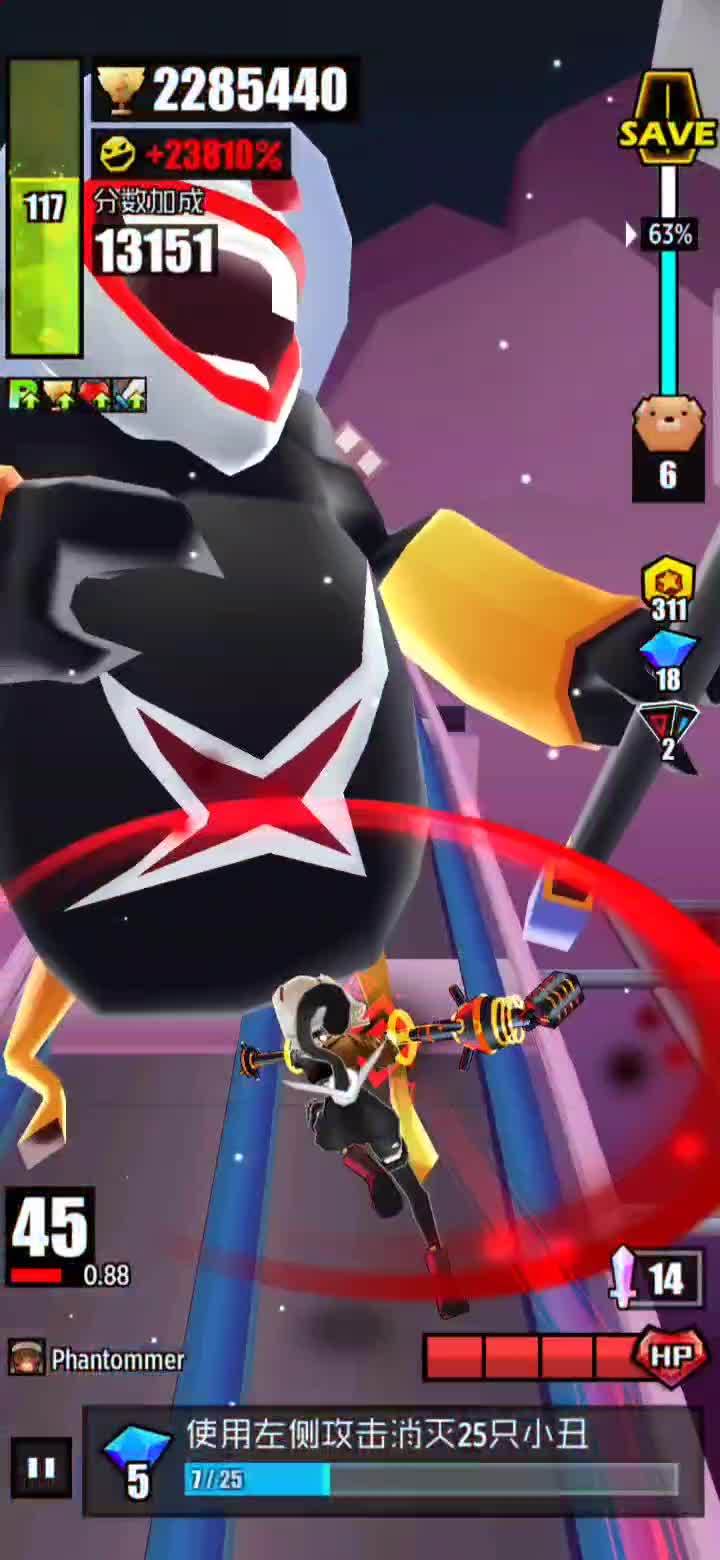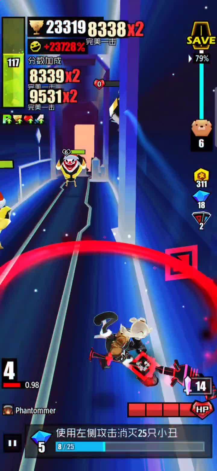 ③小丑种类,个人将小丑划分为:普通小丑,持盾小丑,飞行小丑,博士小丑(能召唤普通小丑并且有光罩保护的),钻石小丑以及大丑(砍三次的大怪),其中普通小丑按正常击杀分Sn进行计算,持盾、飞行以及博士小丑的分数算法相同:击杀分Snp=S×[(n+1)/2+1]翻译一下就是在击杀分Sn的基础上再加上1倍的基础分S,如图所