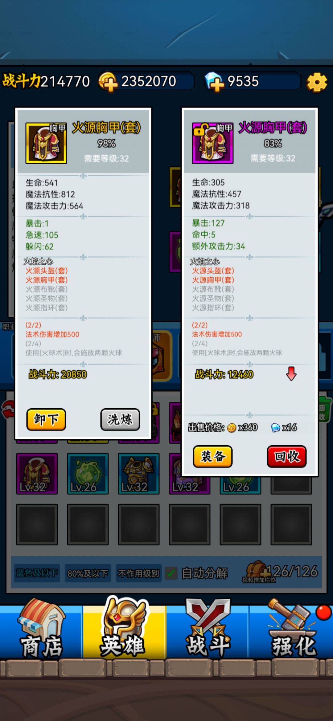 如下图,如果是金色衣服那我防御能力和攻击也会强些,但是紫色那件暴击多了这么多,换掉从87%暴击掉到62%很不爽啊,是你们的话怎么选择?
