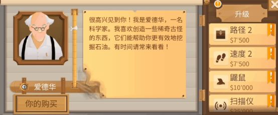 我们可以在工坊内提高探矿者探寻油井的效率,例如提高探矿者的寻找速度,加深探矿者的探寻深度等,还有就是可以在这里购买到一些比较特别的设备,例如扫描仪和鼹鼠,扫描仪可以帮助我们探测一块区域的土地,鼹鼠可以寻找几个不同地点的土地情况,在购买之后还可以对扫描仪和鼹鼠进行升级。
