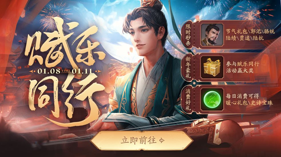 庆祝“赋乐同行”主题新年狂欢夜举办,1月8日20:00,前往虎牙、B战、抖音、快手,三国杀官方直播间观看直播可获得iphone13、纯金元宝、现金红包等更多礼品哦。