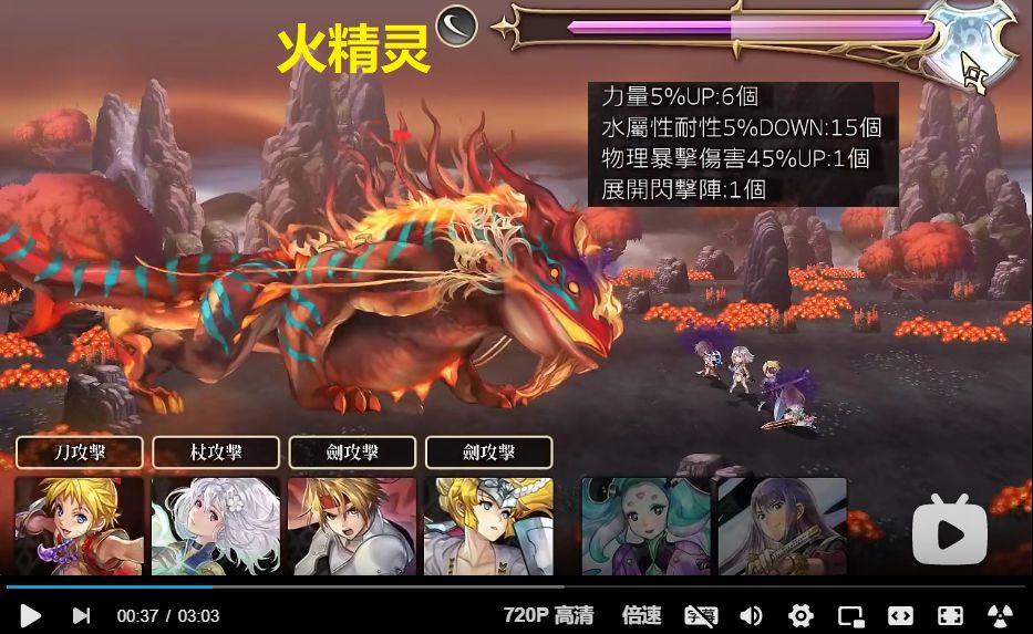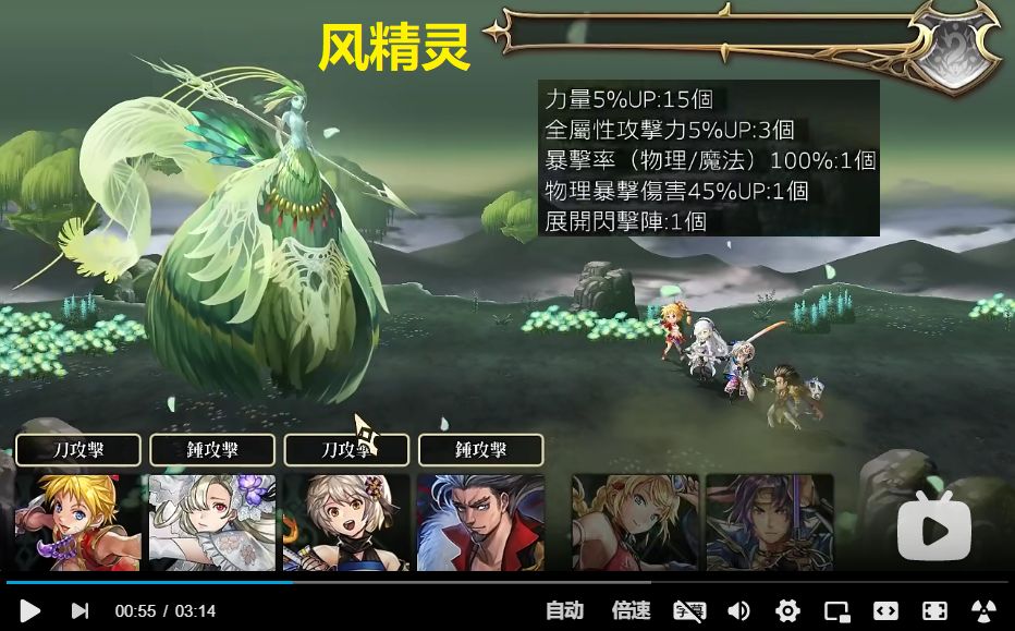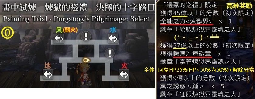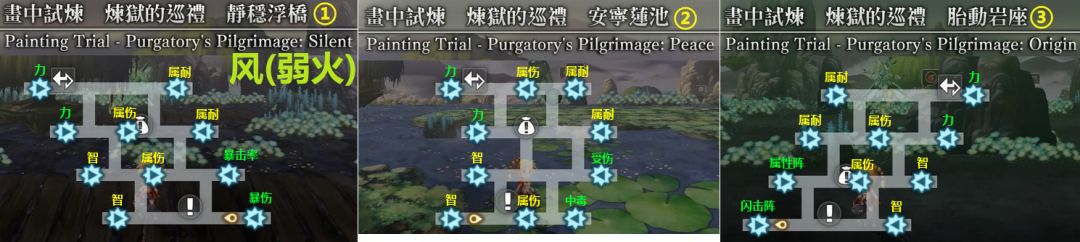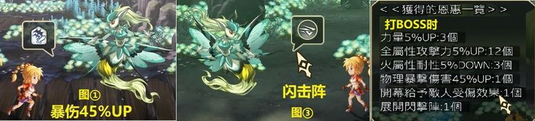 ③第1~3张地图(下图为风精灵地图,地水火类似),打小怪(每张地图最多打3只)获得buff,如暴伤UP、力量UP、获得闪击阵,等等