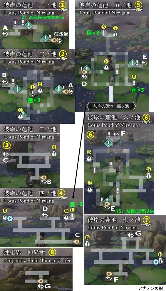 宝箱:1~15,其中1、6、9、11是莲花×3。图④的宝箱10和11要从图⑤最下方隐藏道路返回拿。图⑥的宝箱15要先到图⑦点15让它漂到图⑥,再回图⑥拿