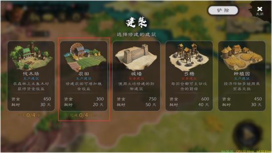 Tips:如果建造农田,则相同位置就不可以建造弓橹和城墙建筑。
