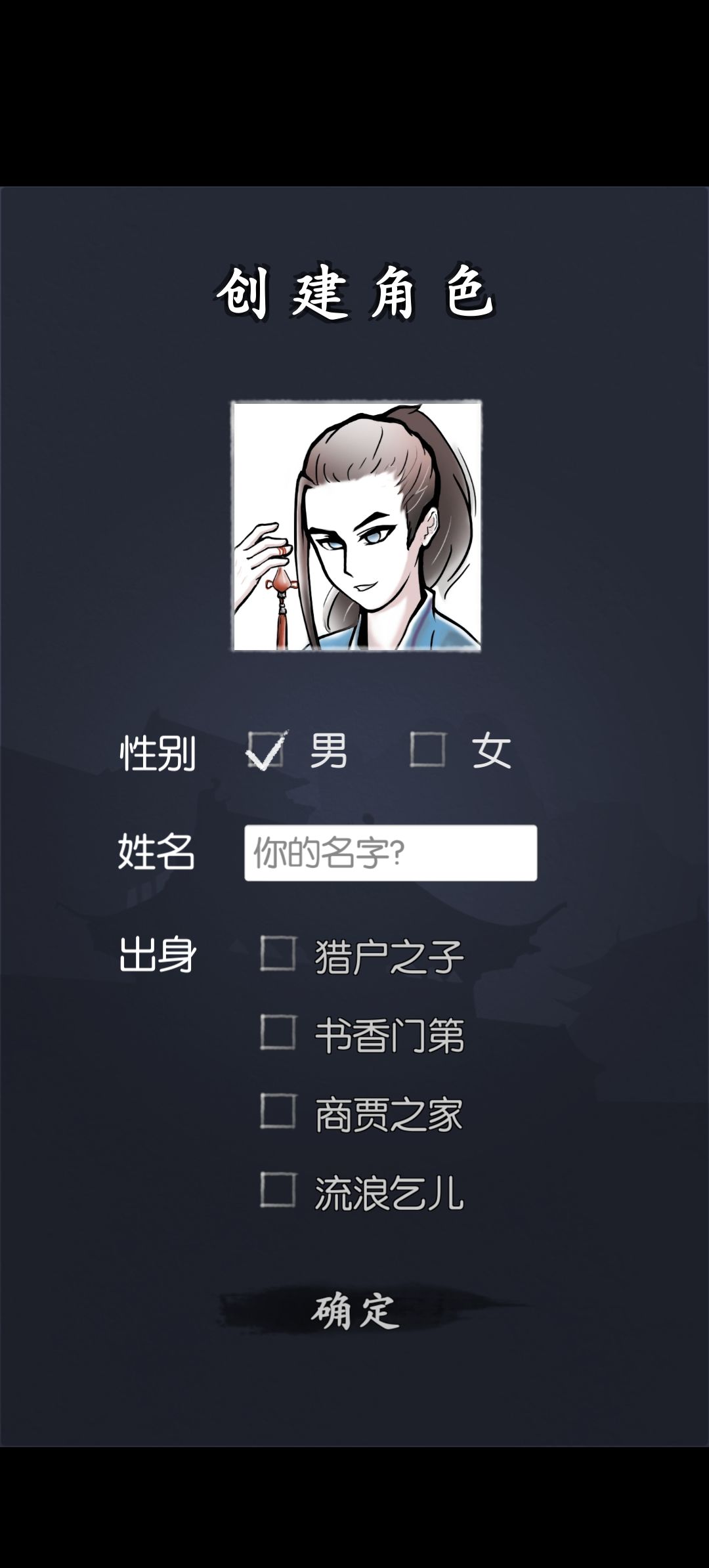 刚入游戏会有身世这个选择,一共有四个,猎户,书香,商贾,流浪,每个身世都会有其对应的天赋加成(两个)