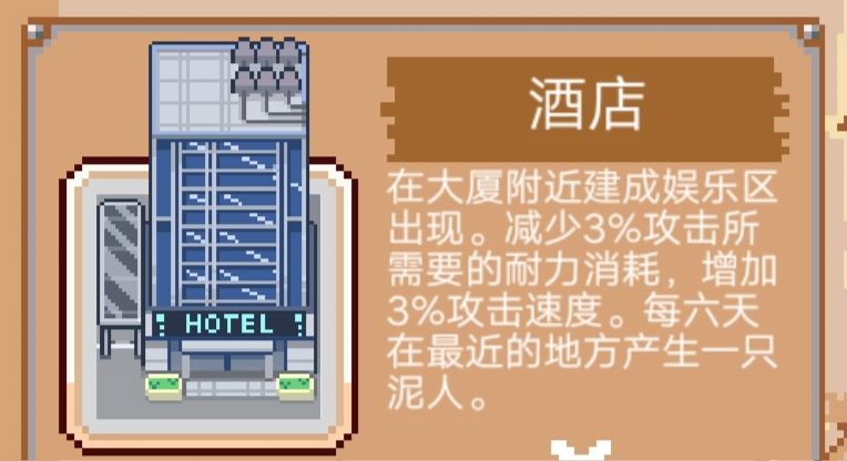“我跟你讲啊,酒店可是个好东西啊它可以缓解你的疲劳增加耐力还可以提高攻速,只需要在大厦旁边建个商场就可以了呢”