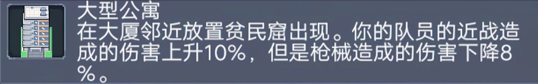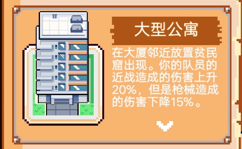 “噢,对了然后到了大型公寓了,这玩意老棒了,可以提高20%近战伤害,更重要的是还可以叠加呢!不过需要要在大厦附近放平民窟。”