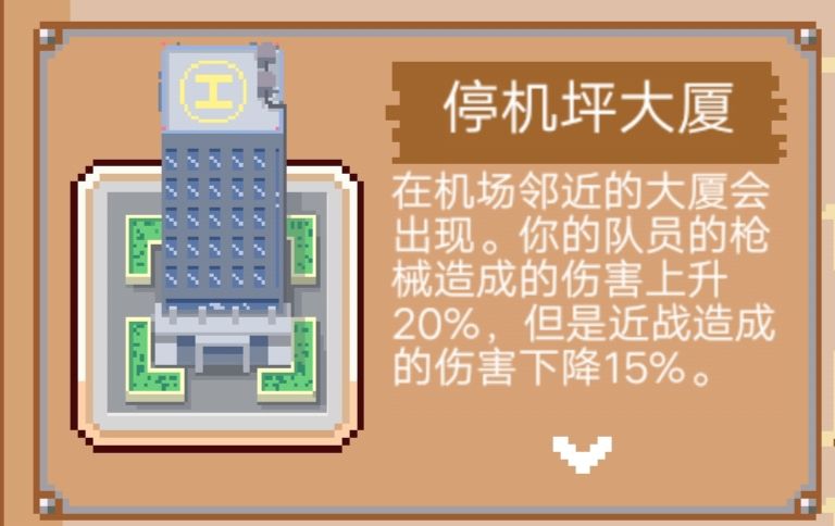 “停机坪大厦需要将大厦放在机场旁边,可以提高20%的枪械攻击,但是会减少15%近战攻击”
