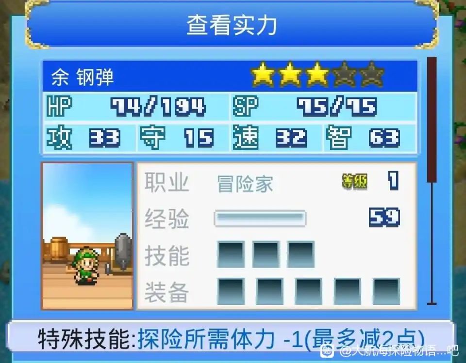 实力方面,因为冒险家这个职业速度成长率比较高,前期也基本没啥好装备。在装备不重的情况下,冒险家闪避率相对于开局几个职业来说仅次于武道家。初始武器是一把匕首。