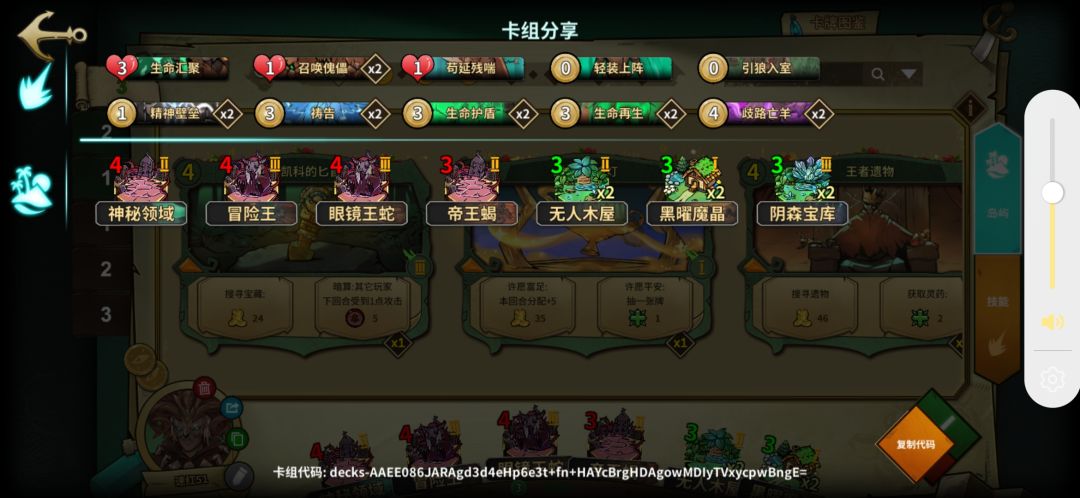 这套牌可以看到锁血牌就带了1张锁7,但是依靠非常快的过牌(基本一轮就能过完),2金卡都是可以吃到两次以上的,其次过牌还附带buff,生存能力其实很强。