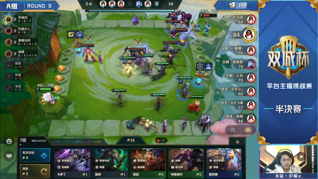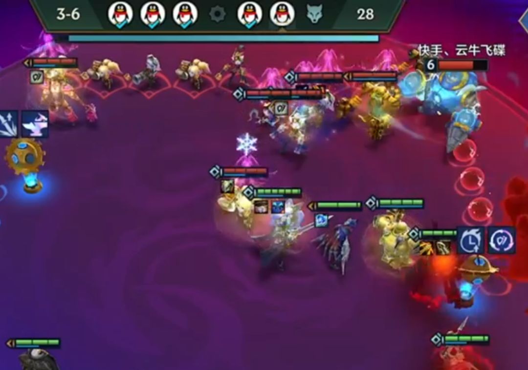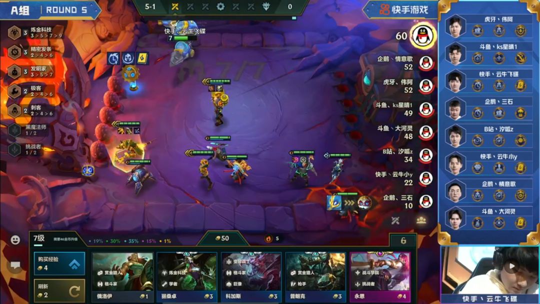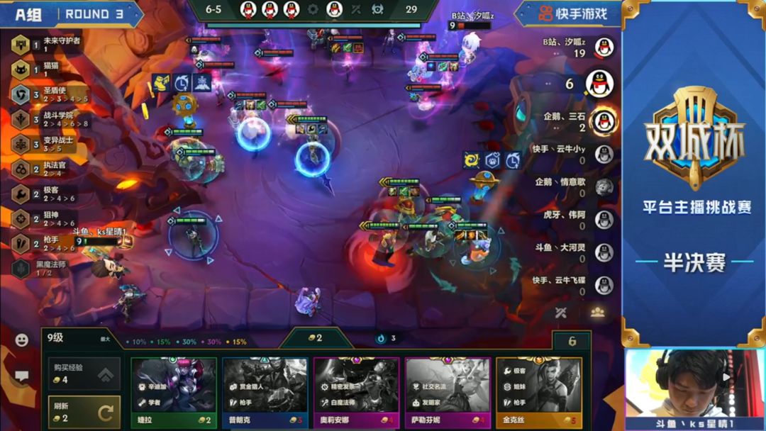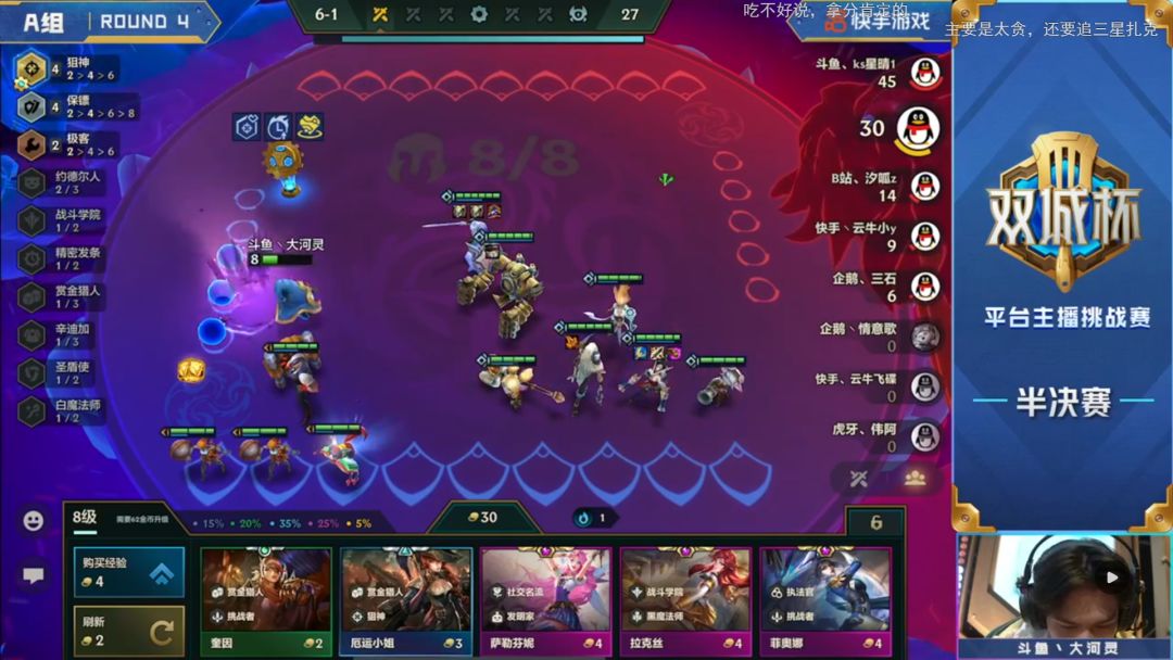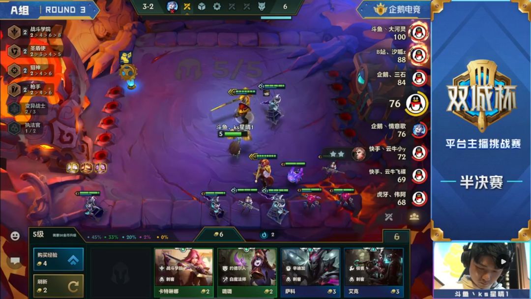 汐呱原本的思路是前期通过三星辛迪加来保证血量健康,顺利上八再去D阿卡丽,但是由于比赛环境,二阶段中期被迫拉过一次人口,所以选择了在不卡经济的情况下多留了卡牌与诺手,看看能不能后面嫖到三星,而通过三星炸弹人的优势在第三阶段只输了一回合,虽然不是五连胜但是也让自己崩盘的经济逐步恢复。