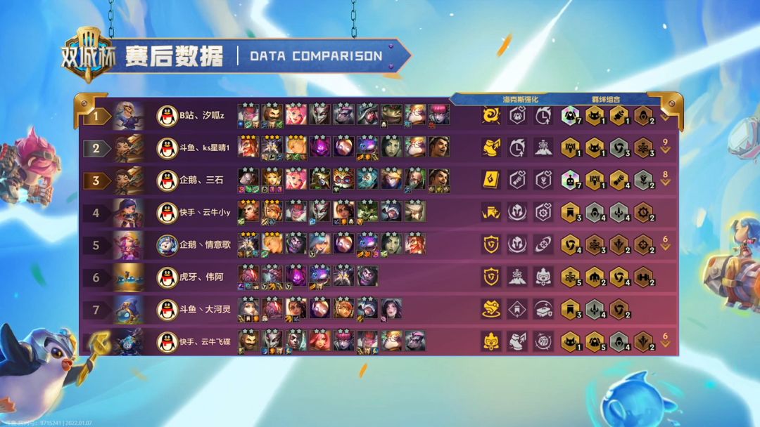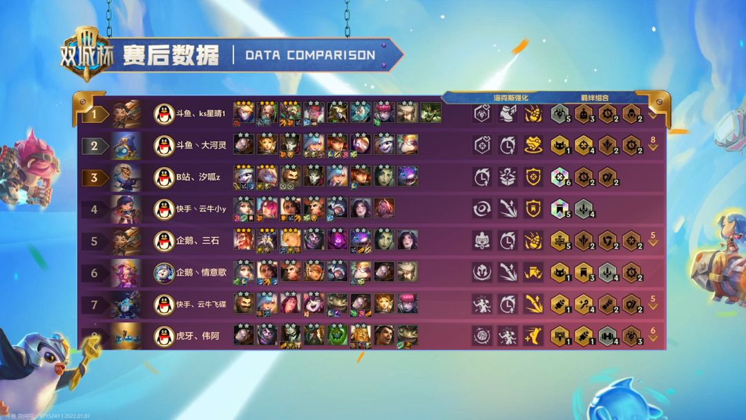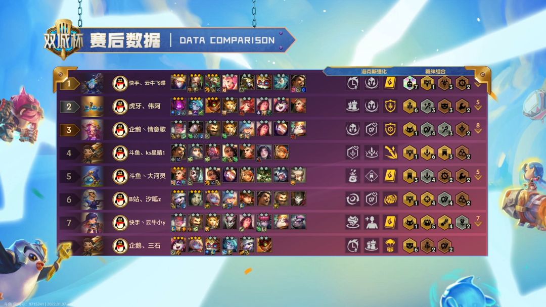 2022年1月6日晚6点《金铲铲之战》首个官方赛事双城杯主播团队对抗赛火热开赛,最强对抗即在这刻一触即发。20名顶尖选手将在接下来四天为我们展现最强金铲铲棋手之间顶尖博弈。锁定虎牙、斗鱼、快手、bilibili、企鹅电竞直播即可观看《双城杯平台主播挑战赛》,20名优胜主播棋逢对手,谁能夺得最后头筹,让我们敬请期待!