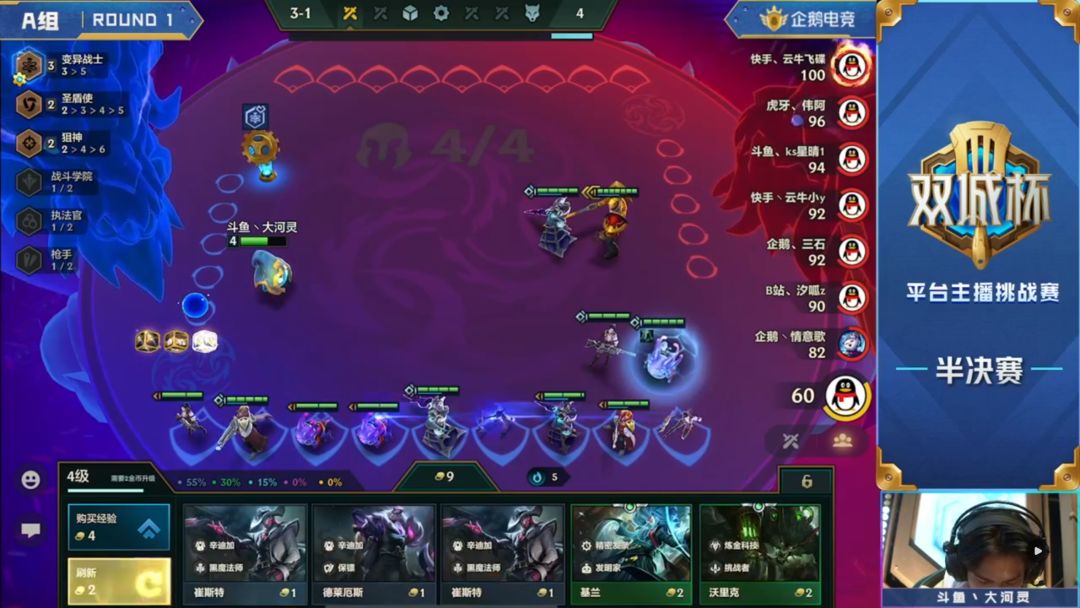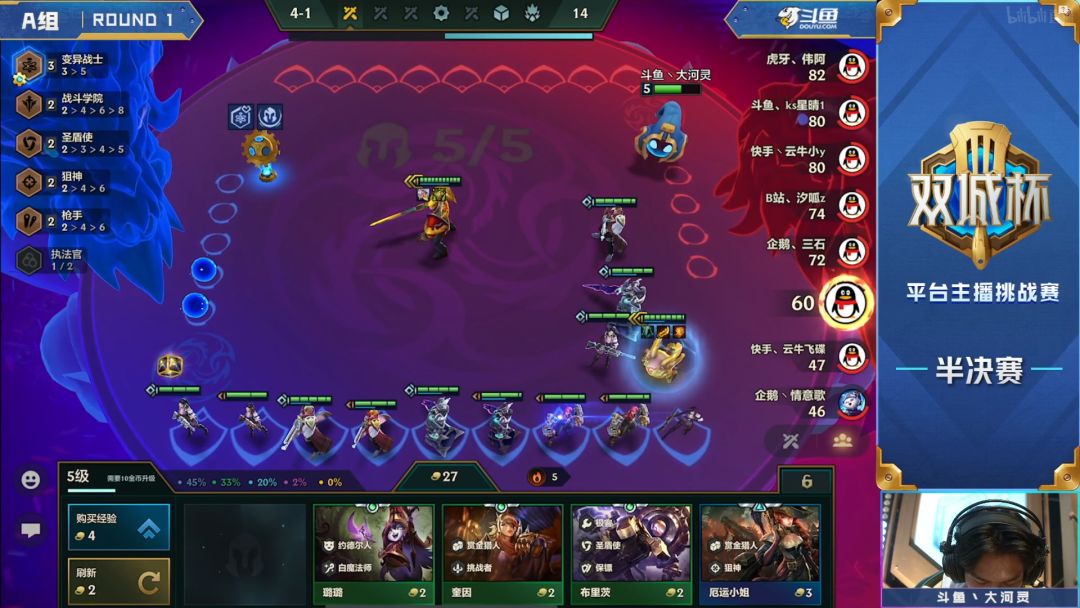 4-1游戏进入中期,同样是因为独家的原因,这局大河灵出奇的胡,在五人口D1费卡的时候轻松拿到三星大嘴,配合两家沙弥拉阵容的提速,在中前期就将游戏环境提速到了一个滴血必争的处境。