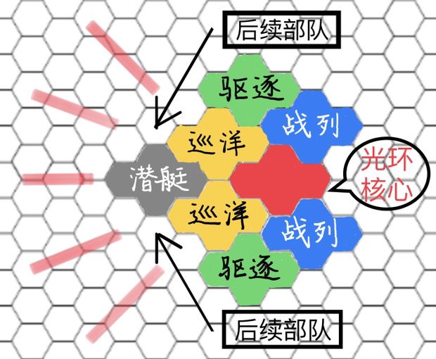 这在海战中非常关键,光环将在场时更得注意,须精心安排。以下提供几种理想情况下的编队阵型: