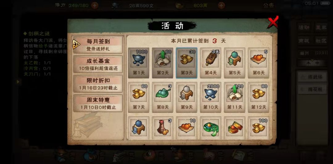 时间是五点零一分,我正在苦练梅花桩,然后那个活动就亮了,我点开一看,哦,签到刷新了,这是我本月第三天签到,正好是30元宝,然后吧我原来是803元宝,领完还是803。还蹦出来一句话什么回档不可重复领取奖励(还是元宝我忘了)。我就提一嘴。我还不至于为了30元宝费这么大周章。