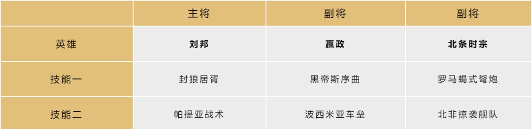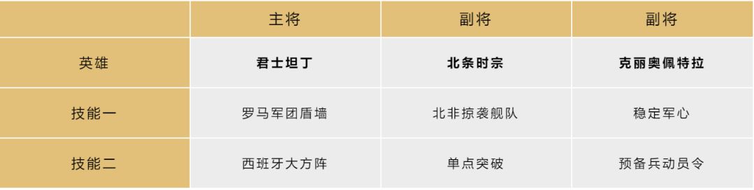 前两套搭配主要适用于没有汉尼拔的时候,可以用北条时宗代替,但是在技能搭配上又比汉尼拔的容错率高,既可搭配主动打爆发,也可以搭配被动指挥类的伤害技能稳定输出。