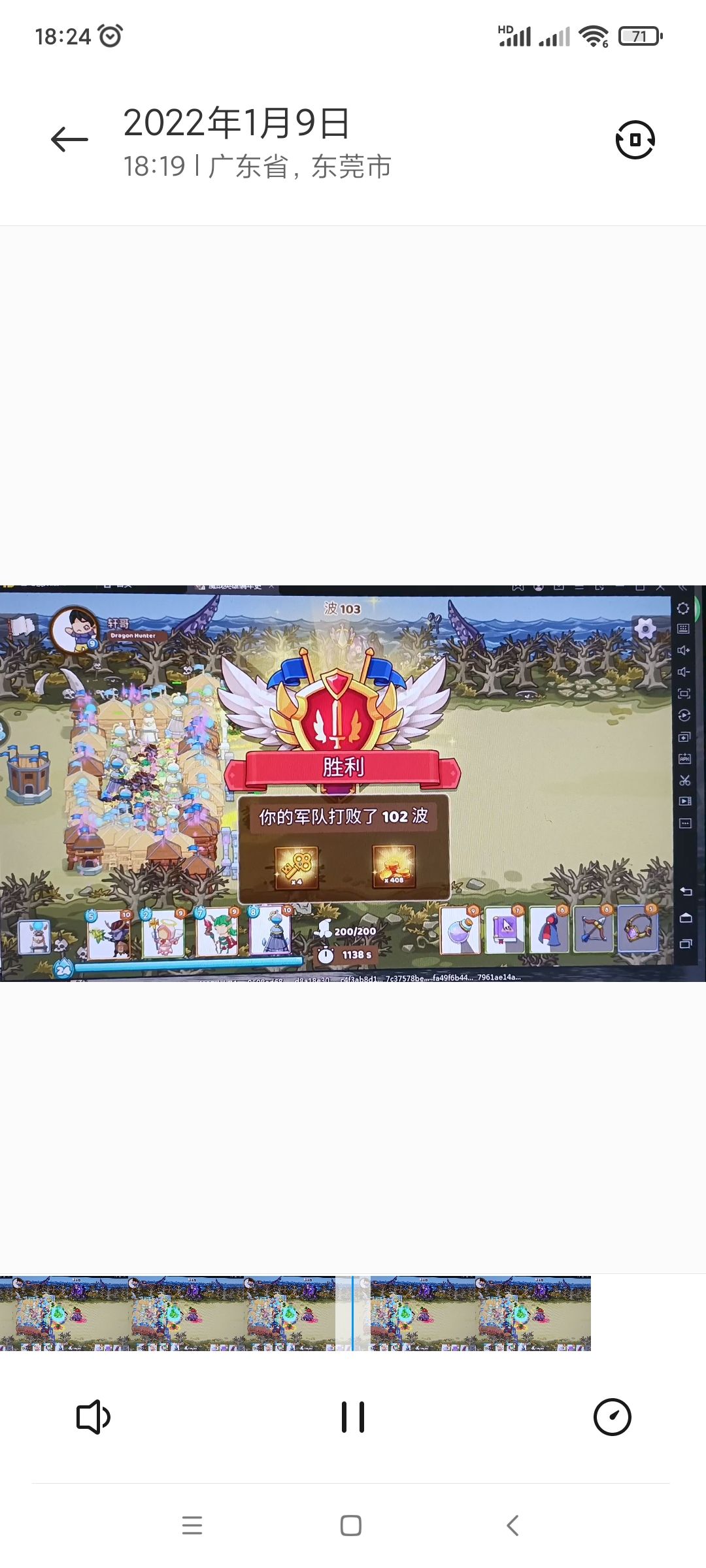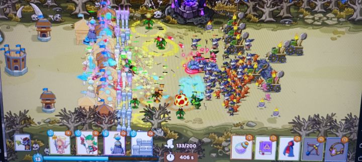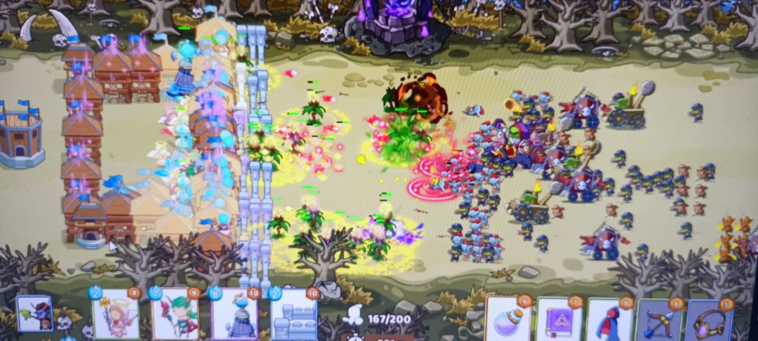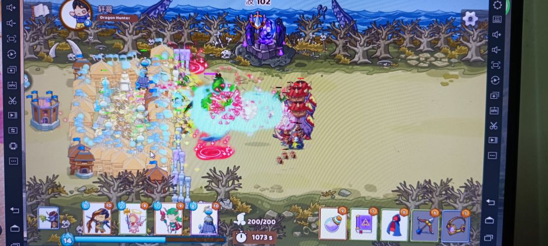 出战阵容和卡牌如下图,前排城墙挡住,然后慢慢砌个围栏,前期全都堆在城墙那一排,放满后再四周放箭塔和闪耀塔,中间扔德鲁伊,剑神,夜精灵,和治疗师,城墙最多砌三层,打破了慢慢补就行了,102波一会就打完了。