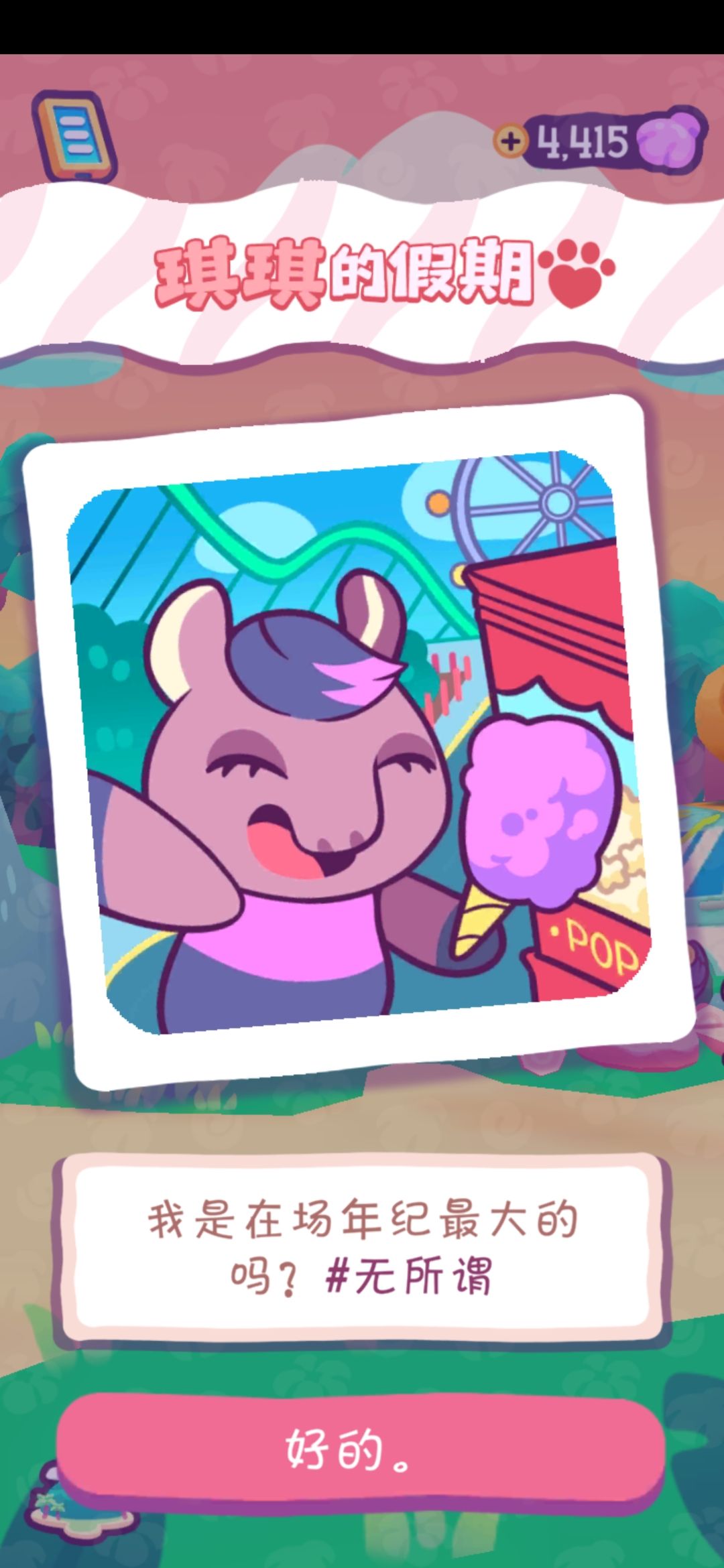才发现黛西(原谅我看不出她到底是什么动物)也有剧情!她喜欢吃泡面🍜,她的梦想是成为摇滚乐歌手🎶,想去城市……(才触发了三次剧情其他的还不知道)