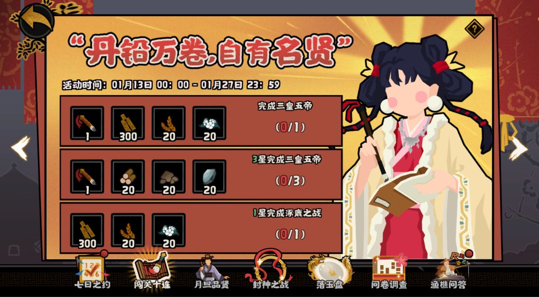 在测试期间,每日登录可领取游戏道具奖励,第七天可领取孙武兵书*50,可直接解锁名臣孙武!