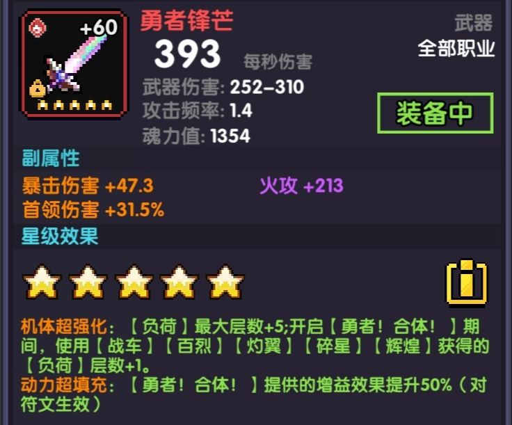 在技能10层[负荷]基础上,增加其最大层数5层,并且在释放佛拉斯系列紫技能时,原本获得1层[负荷],提升为获得2层[负荷]。同时,为技能[勇者合体]的火元素伤害提高90%。