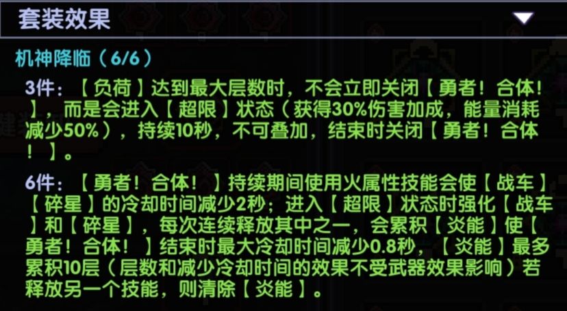 6件套装效果描述道,进入[超限]状态后,每次使用[战车]或者[碎星]时,能为[勇者!合体!]减少0.8秒冷却,最高能减8秒,但是只要2个技能都在[超限]时释放,就会消除冷却效果。所以在进入[超限]状态后,选择连续使用伤害更高的[碎星]。这也是该职业名称[碎星机神]的由来,主伤害为[碎星]。