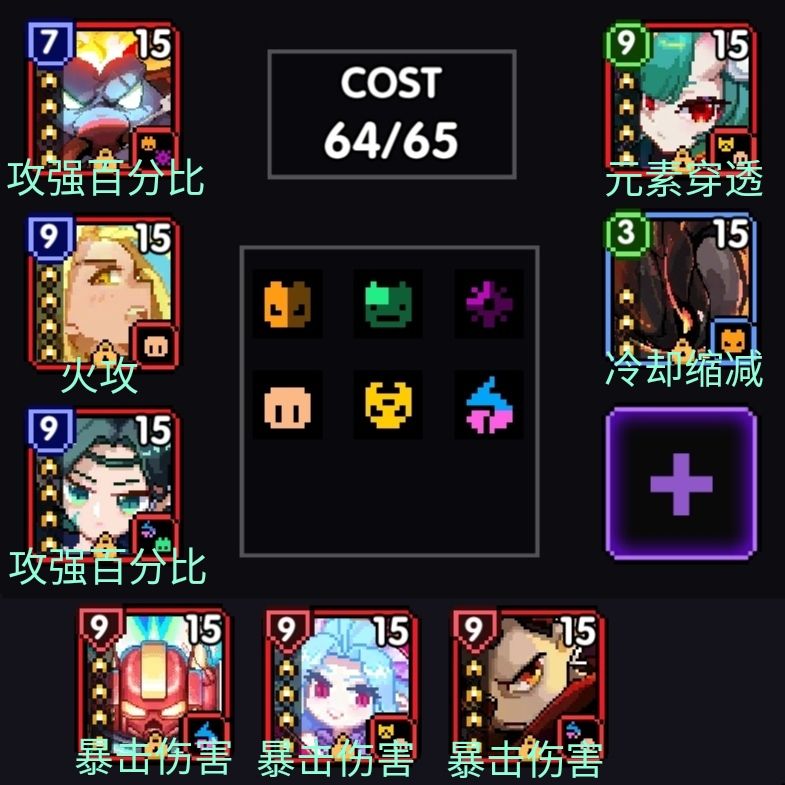 上图是提供给元素穿透不满足2500以上的回归玩家,但是这必须要有副属性4星冷却缩减魂卡搭配才可运用,狗男\狗女提供18%冷却,热情南瓜提供5%冷却,魂卡副属性4星提供10%冷却,其他魂卡副属性累积5%冷却,加起来才能超过38%冷却缩减。