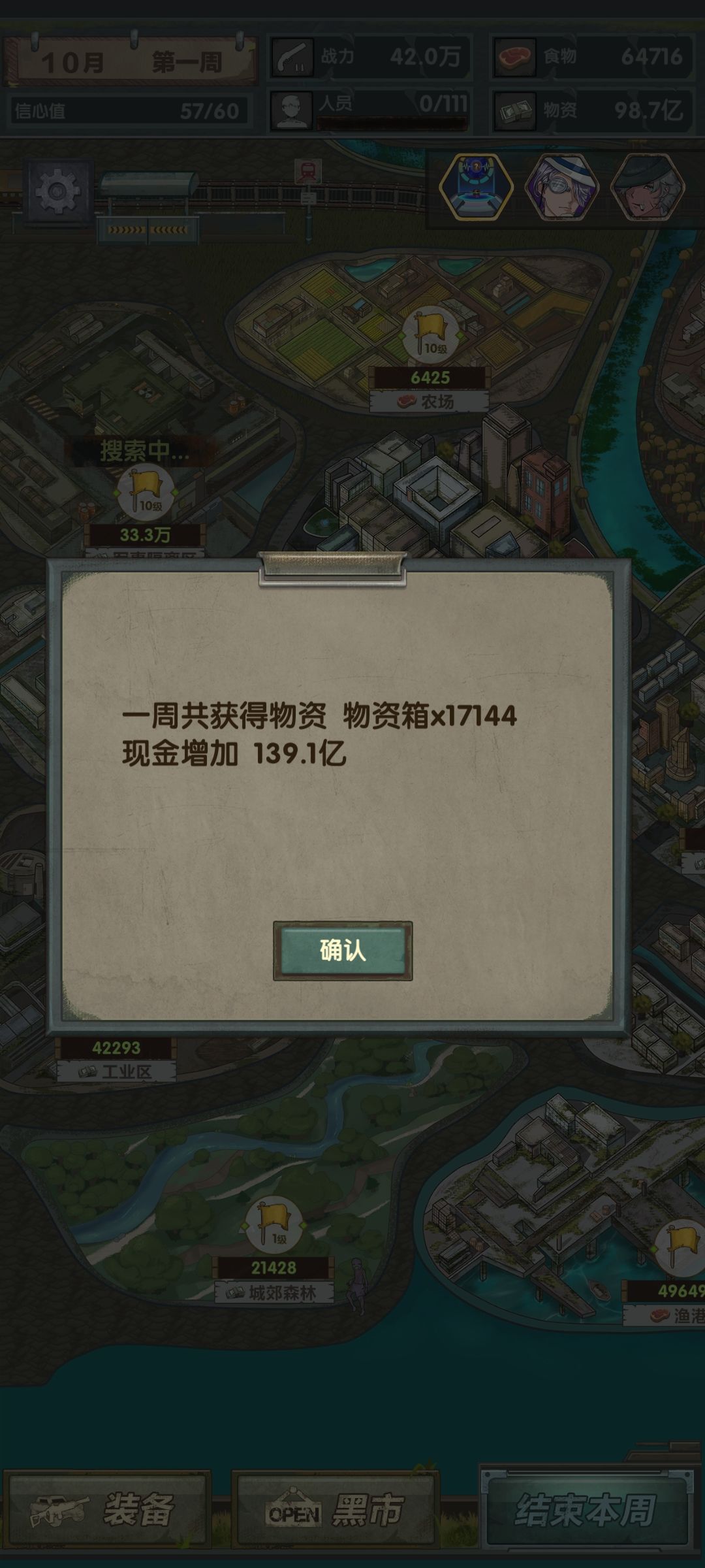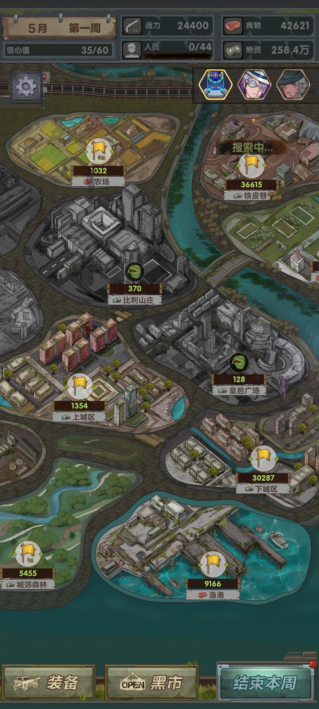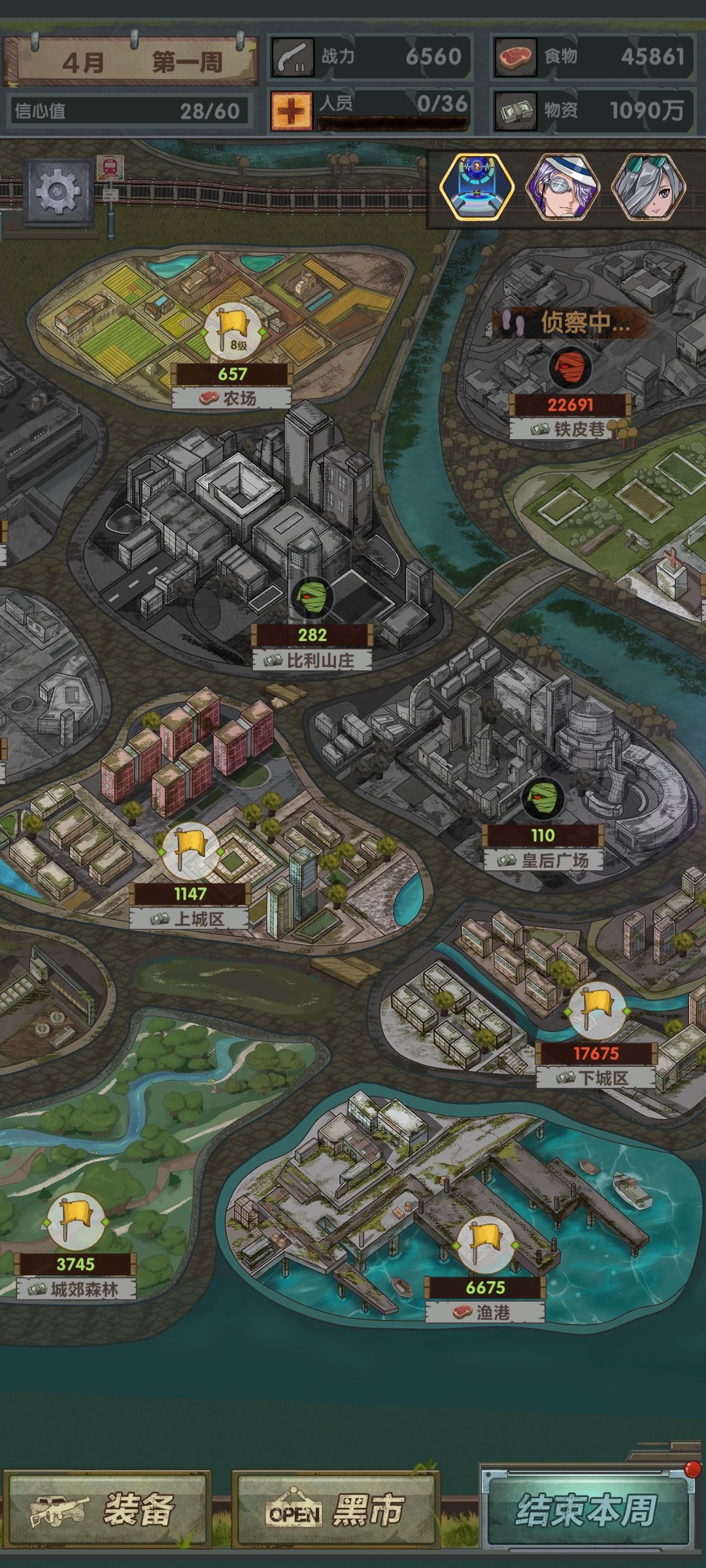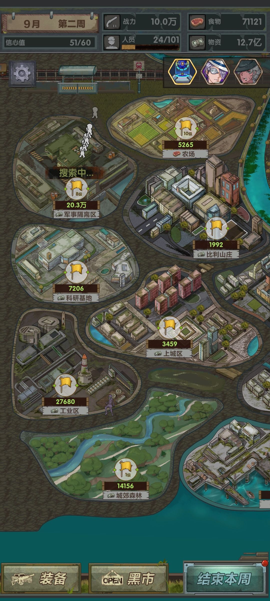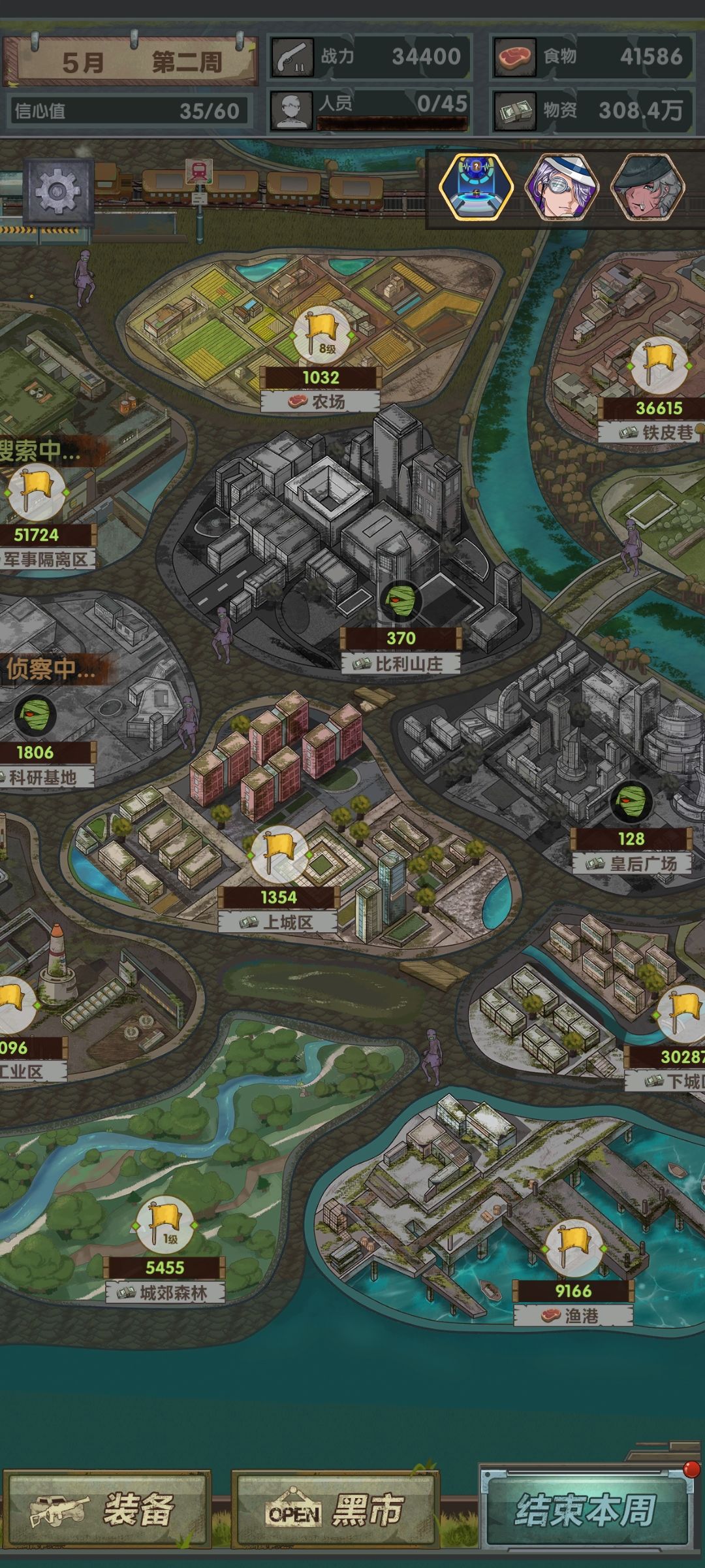第二月,开局遇到爆米花可以选,sl刷点钱换大亨买食物升级农场和公园,探员继续探,打当前战力最高能搜的,能开安全区就开(之后农场满了留几万食物就可以换掉大亨)