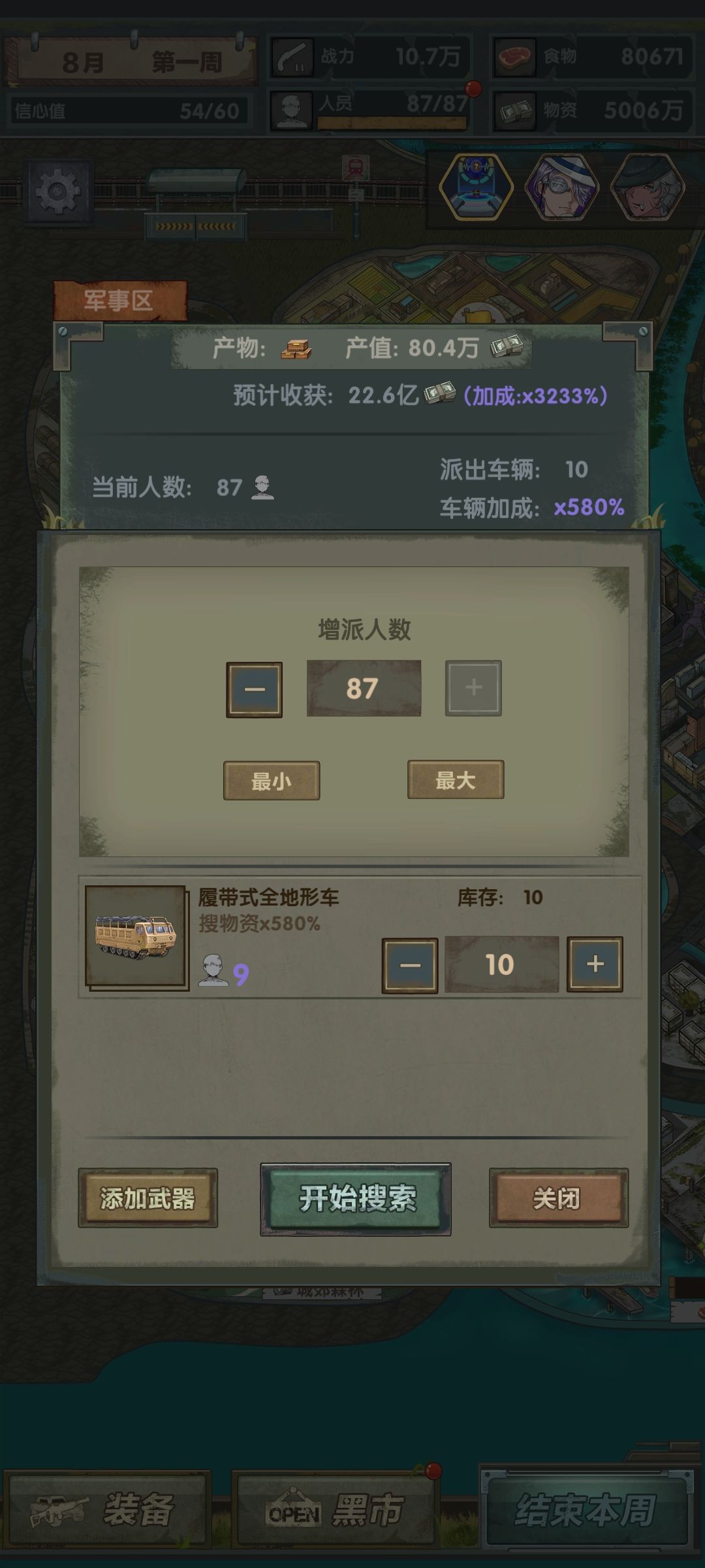 第一月:开局sl爆米花,刷三次黑市,300万以上即可,中途赚的几十万以及开局的钱可以升级仓库,大概1900左右就行了,然后换大亨买食物升级安全区,看价格觉得差不多等级了换掉大亨,掏出探员,人员带武器车搜最高战力能搜的,探员探农场两次后探下个战力可搜地区,之后一直探就行