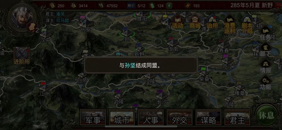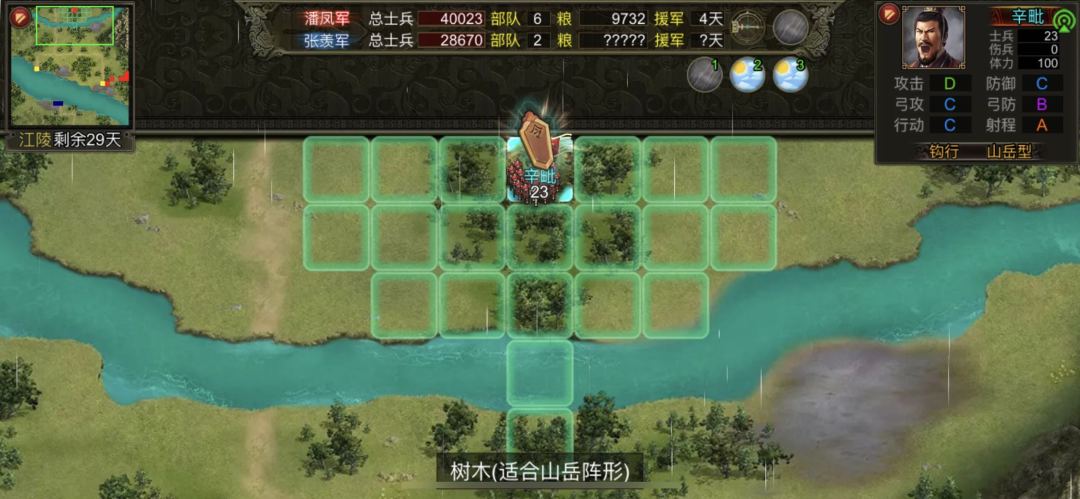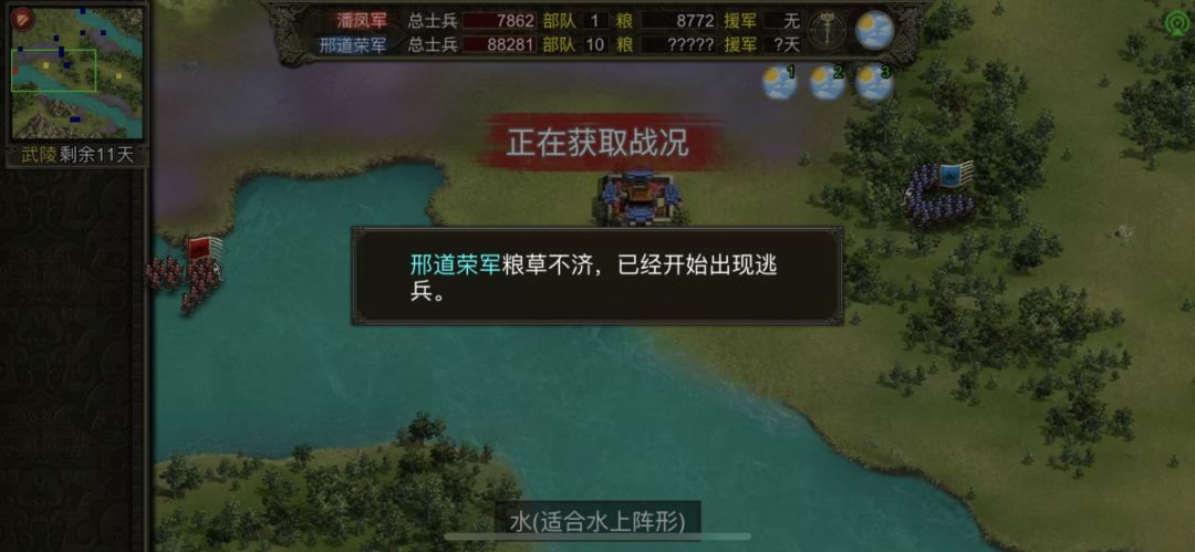 4个政令对应4个城池,武陵和长沙我选择了武陵,主要看中了两个沼泽区可以转圈圈,需要提前预测对方轨迹,可以选锥形或潘璋\鞠义锋矢,带上疾行马,有飞燕或船带上最好,武陵在最后几天对方就耗光粮了,如果不小心翻船了也不要紧,接着耗,大不了再用一个政令速行或者下个月灭是一样的。