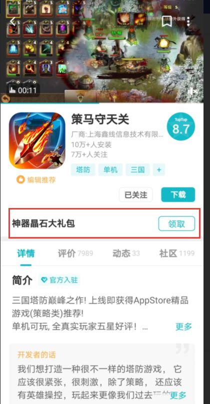 请在TapTap 【策马守天关】游戏详情页,点击领取礼包码。