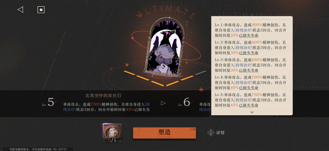 而终极神秘术只能靠“塑造”提升。通俗易懂的说,就是从多抽几次,抽到此角色的次数越多,大招越强。介绍完人物,我们再去战斗界面。