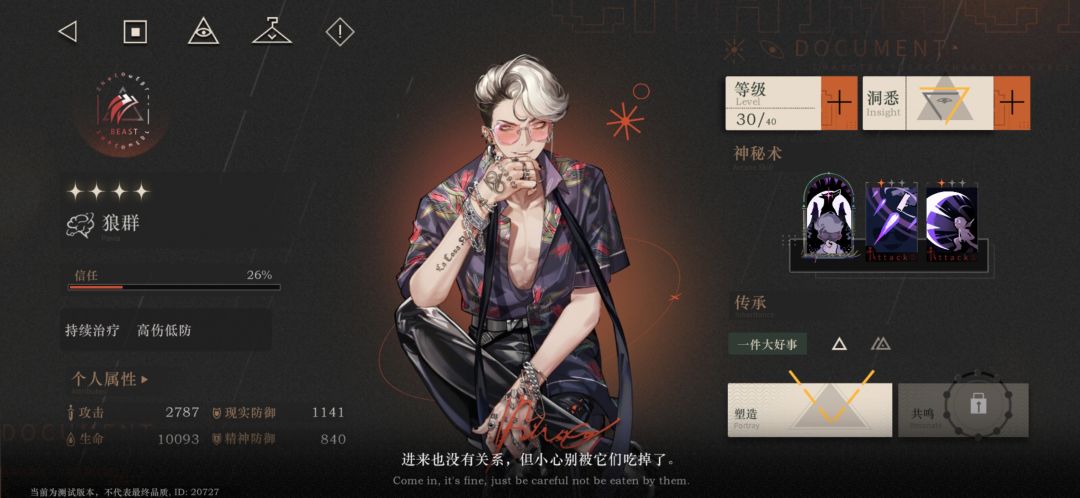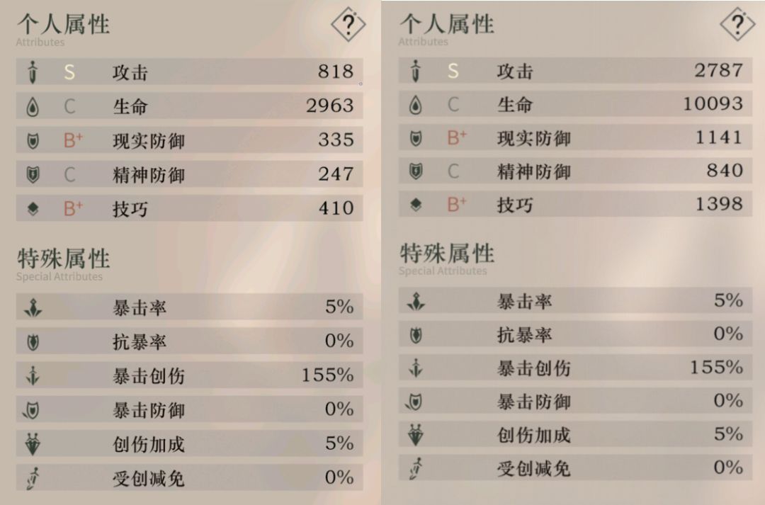 左侧是狼群1级的面板,右侧是狼群洞悉一30级的面板。我们可以看到,个人属性会随着角色等级以及洞悉等级的提升而提升。