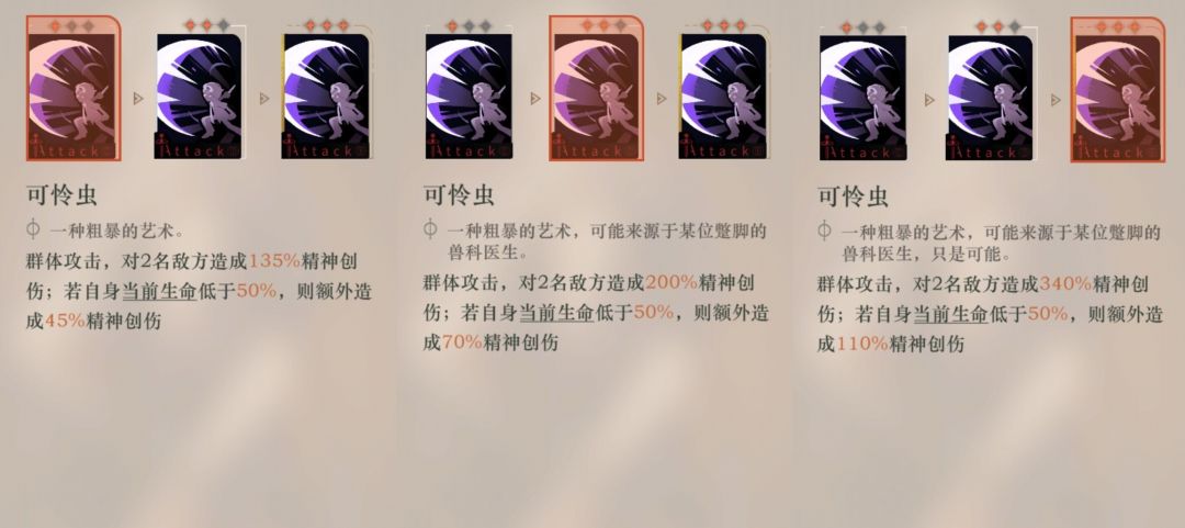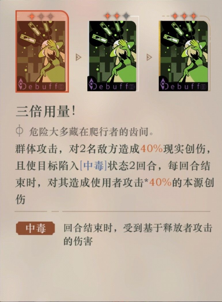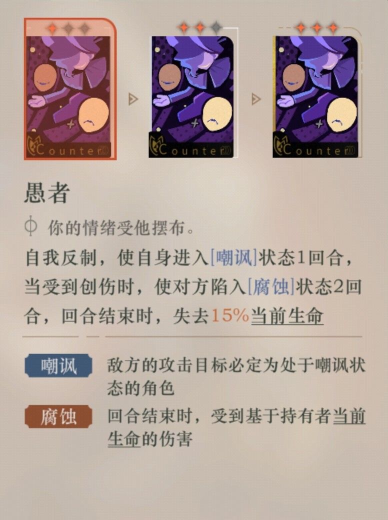 敌方均有腐蚀状态,如果弄臣当前回合状态栏没有嘲讽效果,愚者这张牌,本回合优先级依旧仅次于大招。同种卡牌,高等级优先被选择。如果有多个大招,优先选择最靠近右侧的大招。还有一种,如狼群的攻击牌:
