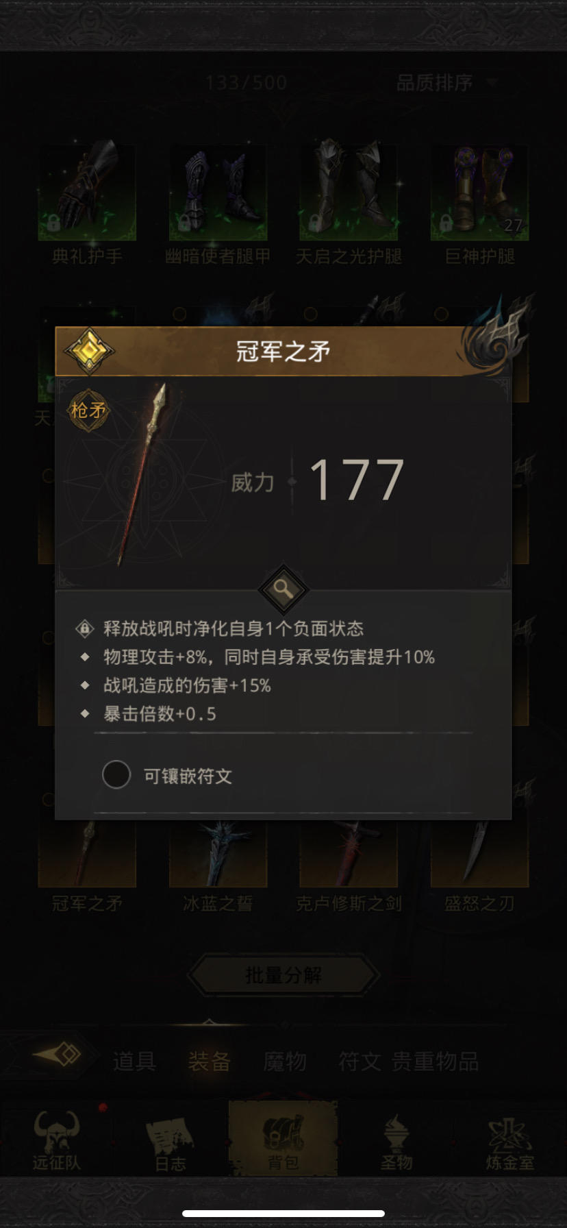 打完复苏的银月谷,出了个这个矛,所有角色武器位置我都看了,没有那个角色能带这个,不知道下个新角色是啥,看这矛的词条是个物理类