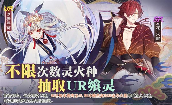 活动描述:活动期间,开启福袋卡池,只可使用灵火种抽取,卡池内新增UR飨灵-冰糖燕窝和SR飨灵-金华火腿,御侍大人每一次十连都有2次机会可以免费替换已经抽到的飨灵。