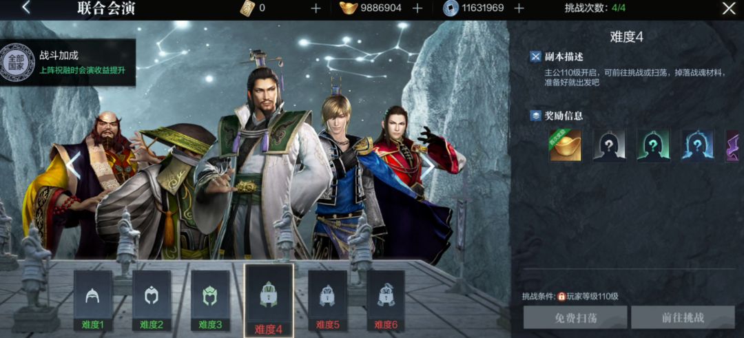 选择低难度会演挑战时,小霸王们玩家等级满足即可进行挑战,而在高难度会演当中,还有武将上阵星级与品质的要求。