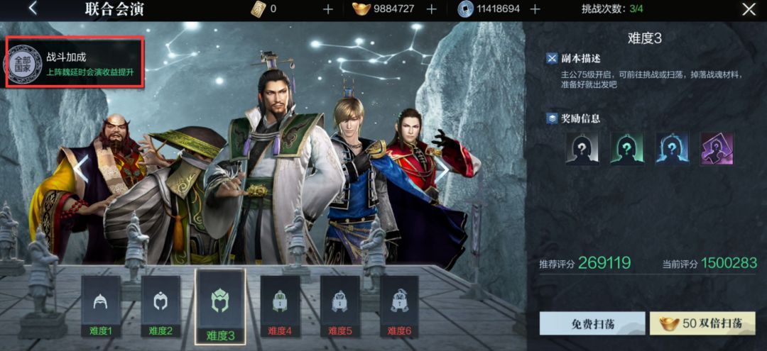 当我们上阵某些会演特定武将时,还可以获得额外的战斗收益,比如在下图的联合会演中,上阵魏延时的收益就会提升,在满足过关的前提下,小霸王们可以上阵对应的武将,来获得额外的收益。