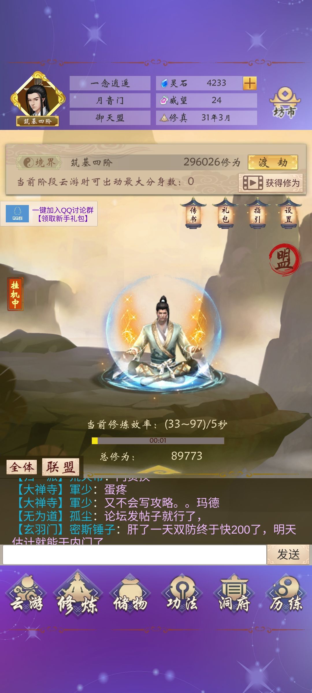 1.进游戏后角色会自动挂机修炼,修为满足了就点渡劫,前期点到练气七八层就可以了。