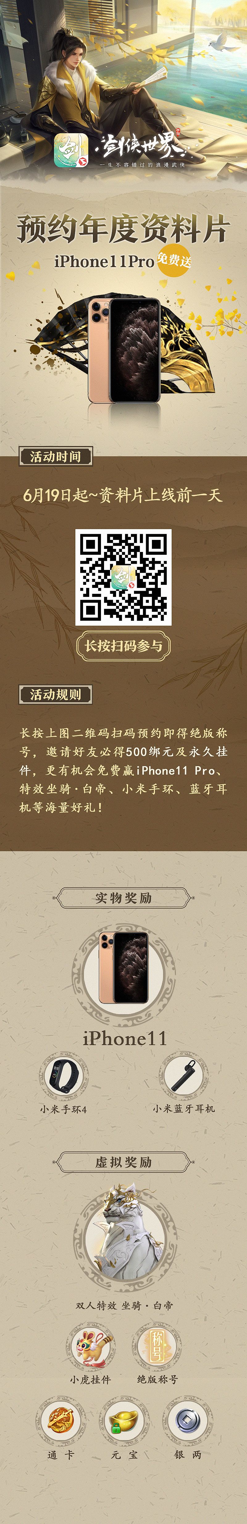 《剑侠世界》手游年度资料片「段氏惊龙」预约活动今日开启!长按下图扫码或在官方公众号(jxsjsywx)后台回复“预约”即可进入预约站,预约即得绝版称号,邀请多名好友必得500绑元及永久挂件!更有机会免费赢iPhone 11 Pro、特效坐骑·白帝、小米手环、蓝牙耳机等海量好礼!