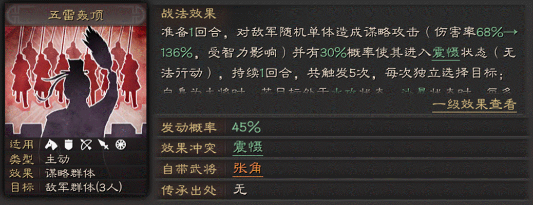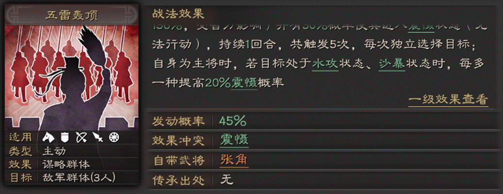 02张角自带战法-五雷轰顶1、准备一回合,45%的主动战法。虽然有读条,但是发动概率比较高,众所周知,但凡有读条的战法,威力一般很强劲。