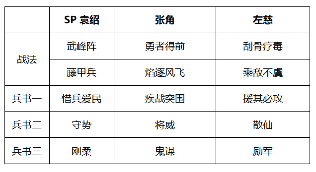兵书方面张角和左慈是固定的,SP袁绍是看个人性格,我个人喜欢回血撑回合。