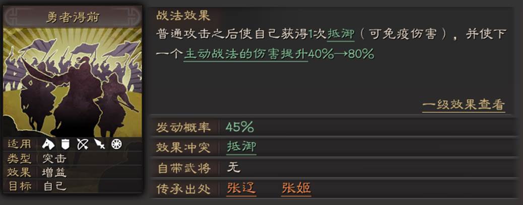 01核心战法“勇者得前”1、突击战法,45%的概率,算比较高的突击概率了。