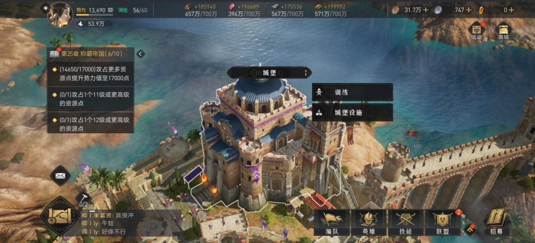 1、资源:前期粮食够用不需要打粮食地,因此多打一些木材、石材、黄金这几个地。加入联盟后,可以在联盟里每天免费领取资源(如图所示)