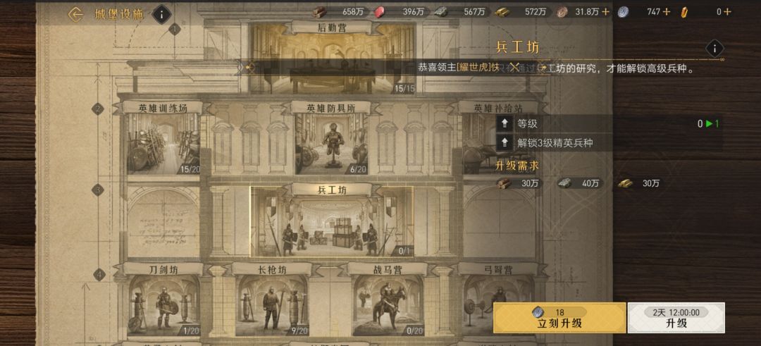 里面的后勤营必点(增加出征上限)兵工坊和高级兵工坊即解锁精英兵种(每个国家的精英兵种在下面说)