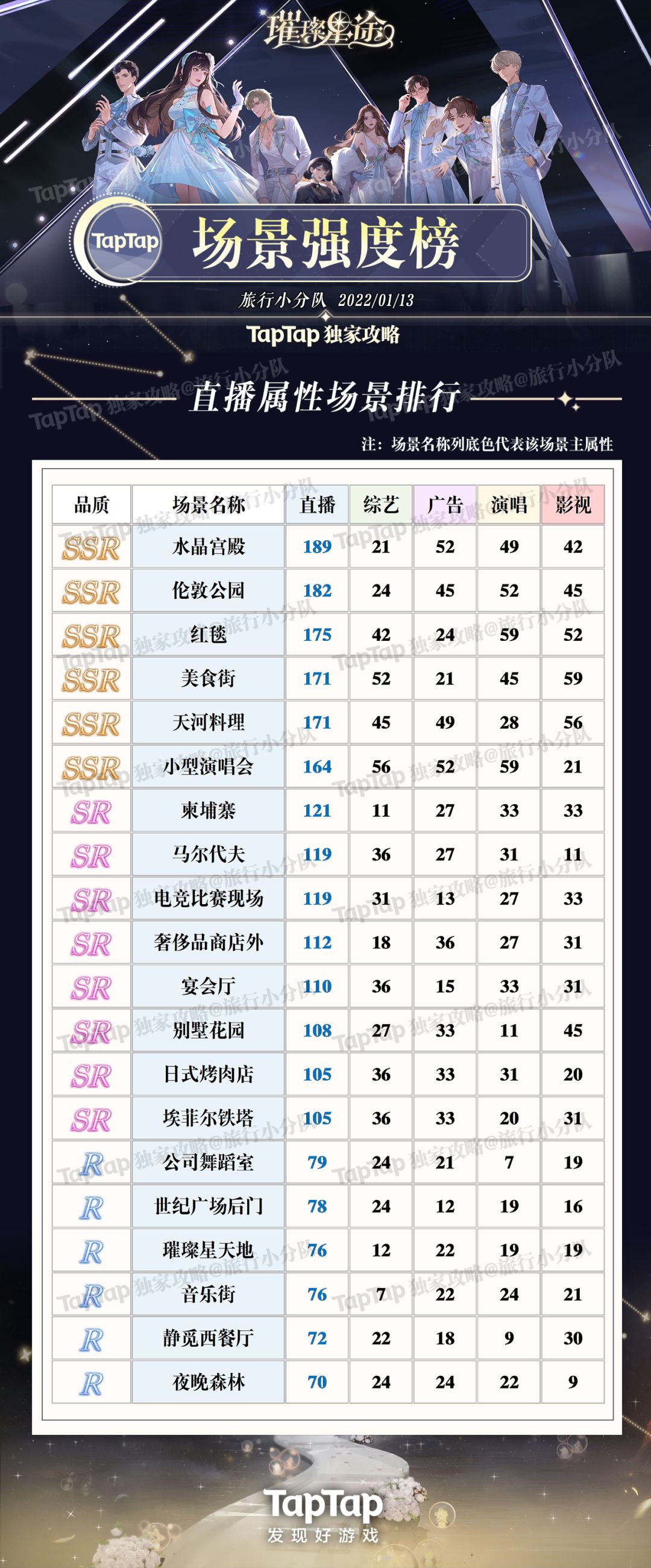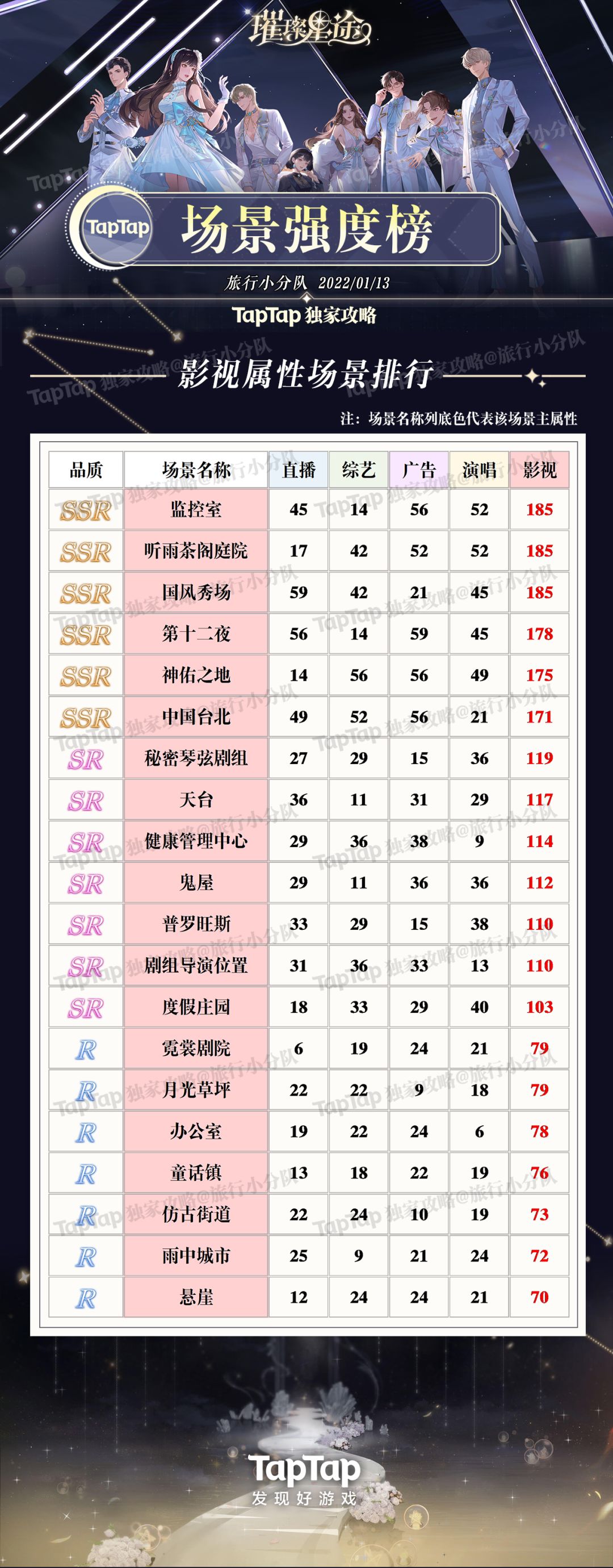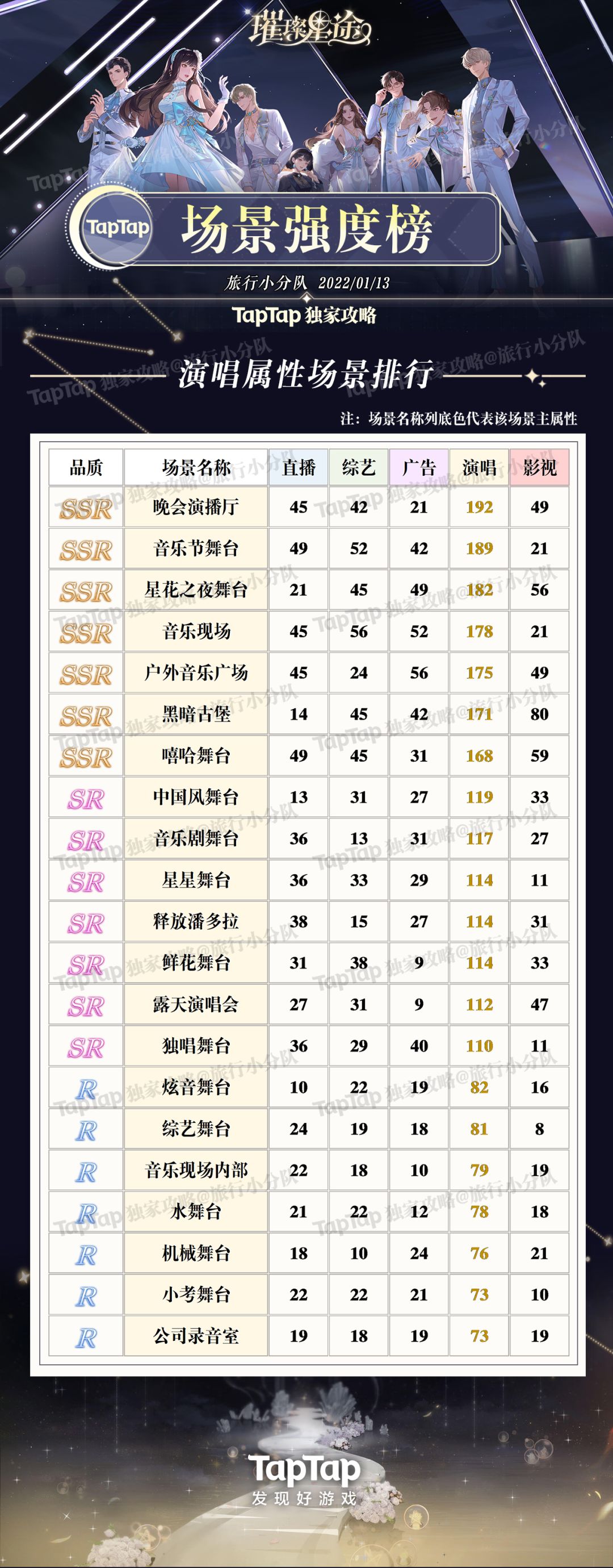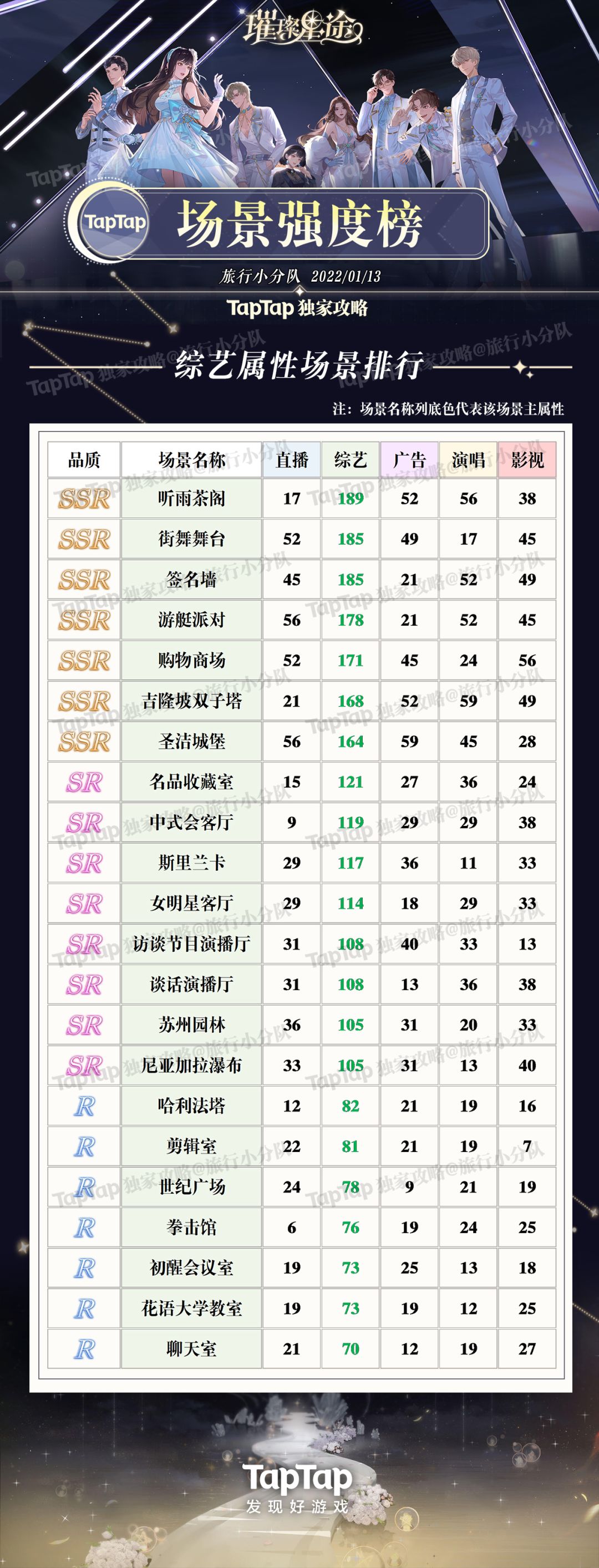 《璀璨星途》中场景一共五种属性,品质分SSR、SR、R三种,没有技能,可根据品质高低和需要的属性养,同时记得养可以升华的高品质场景。 可以先养升华较多的SR,常驻的SSR可以等抽到重复SSR能升华的时候再养。