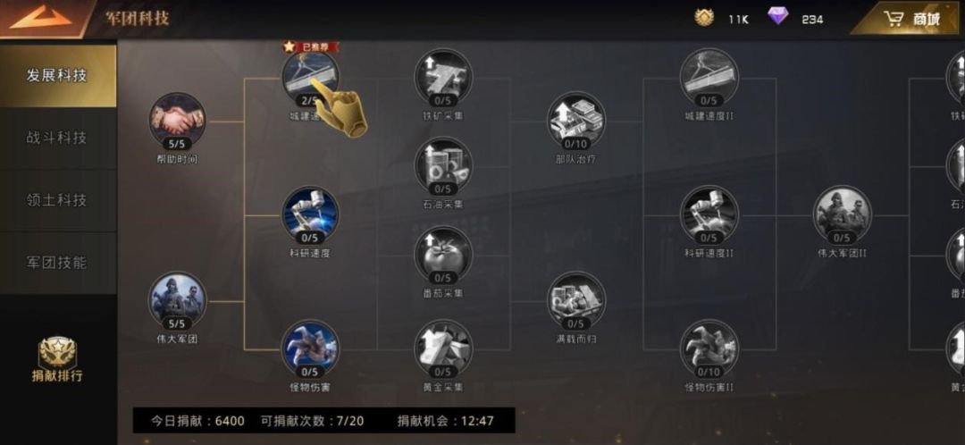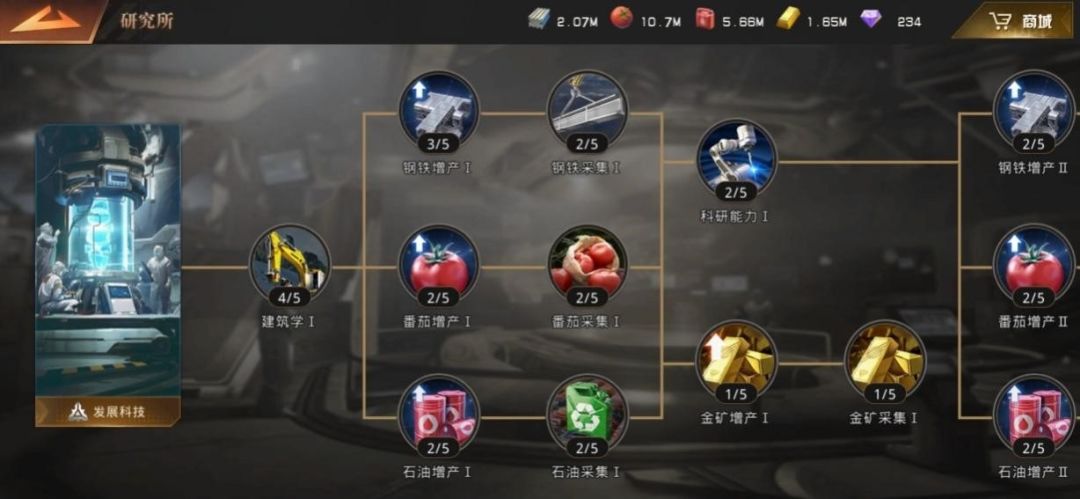 ③科技:发展科技,前面把建筑科技和研究科技点满,能省很多加速劵。军事科技,这个可以一直往后开,先完成任务。